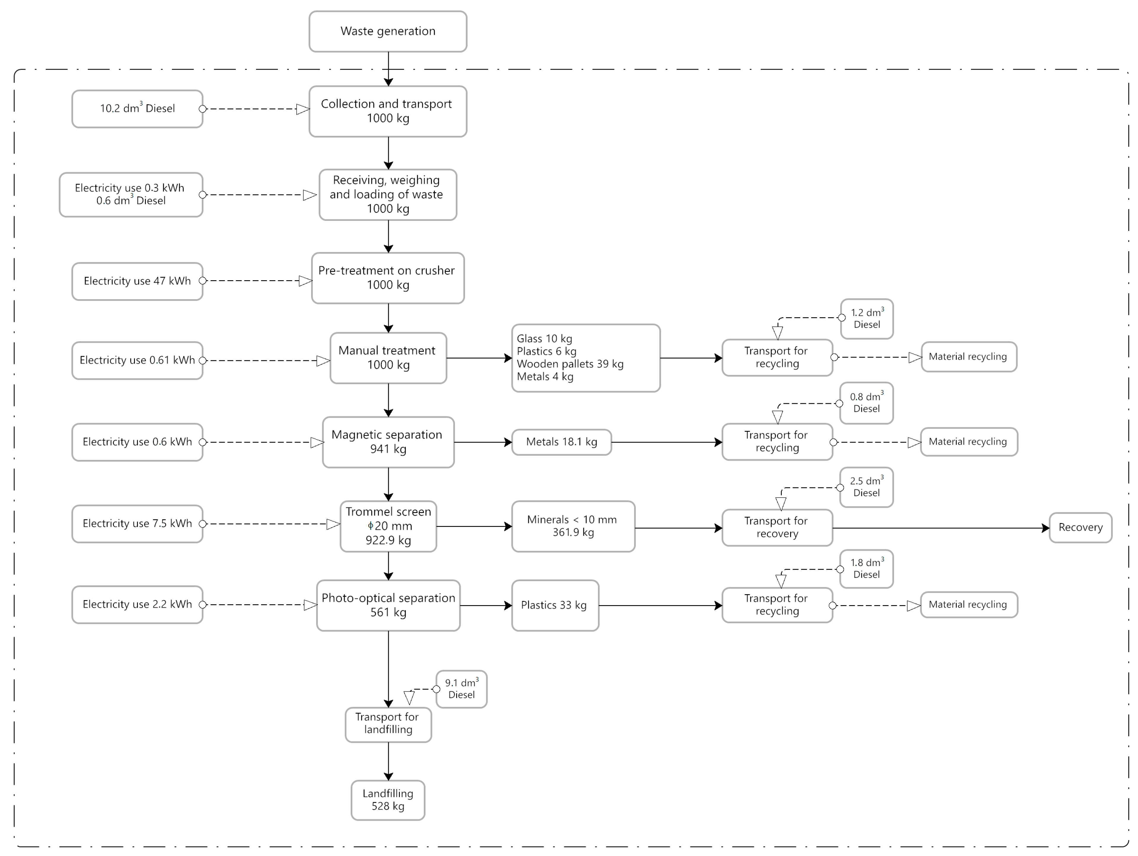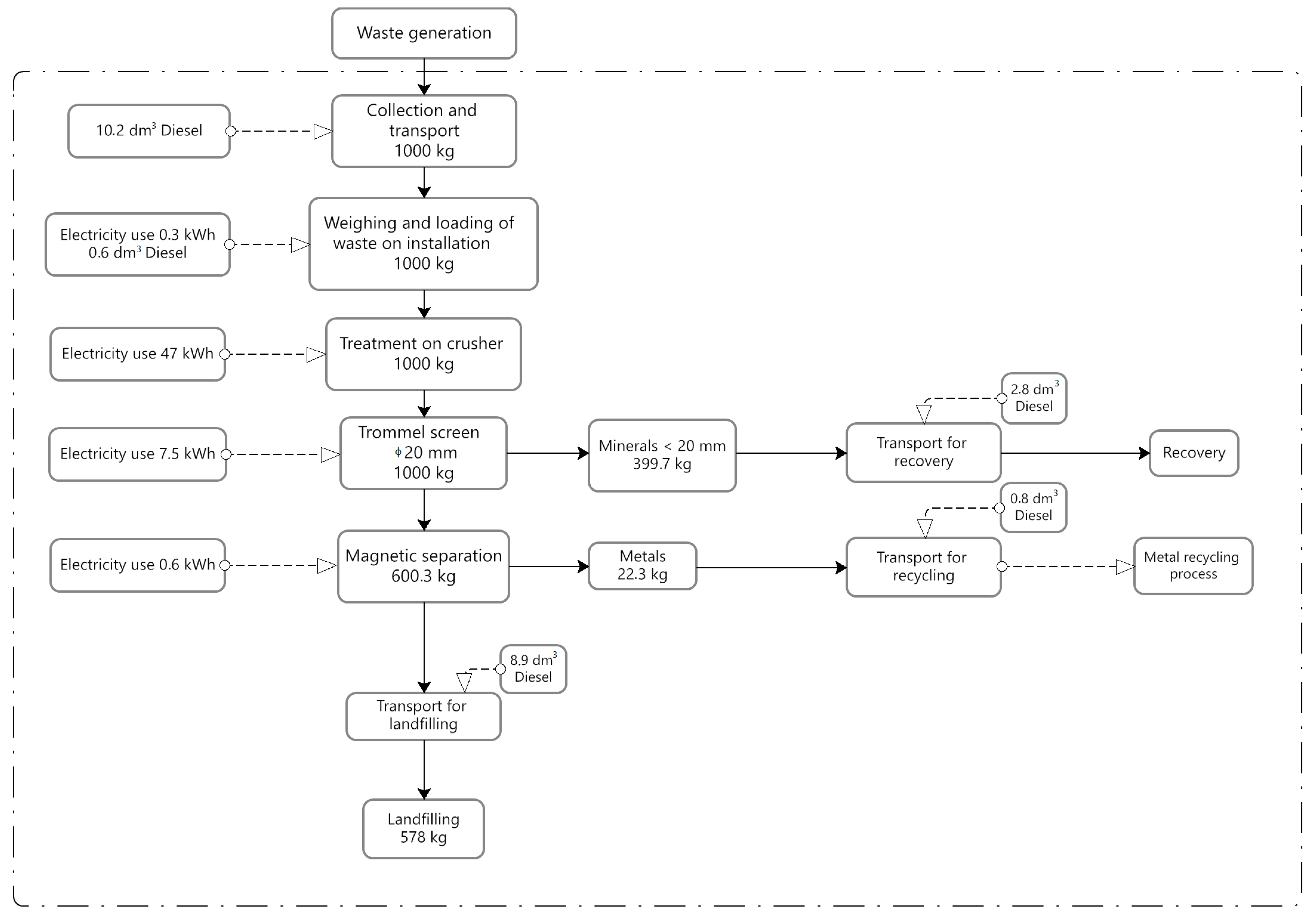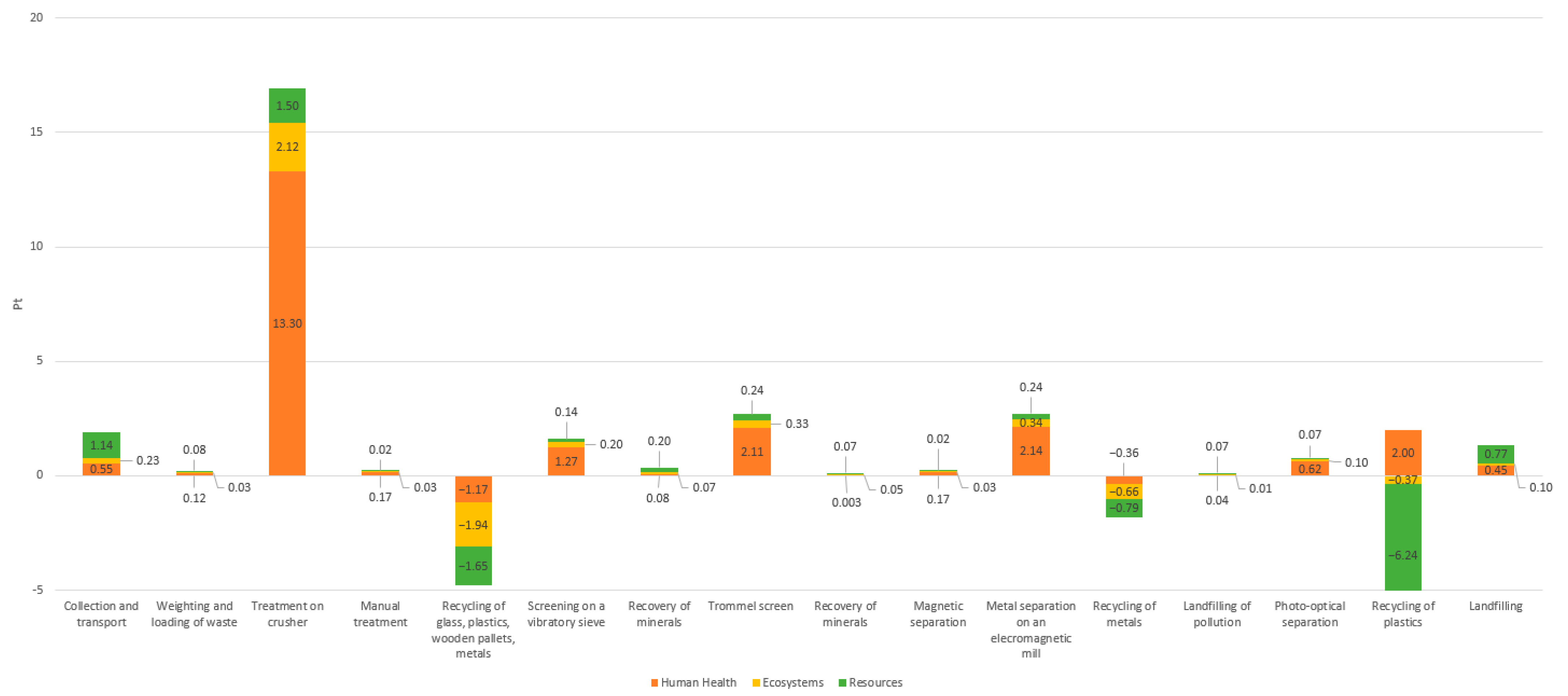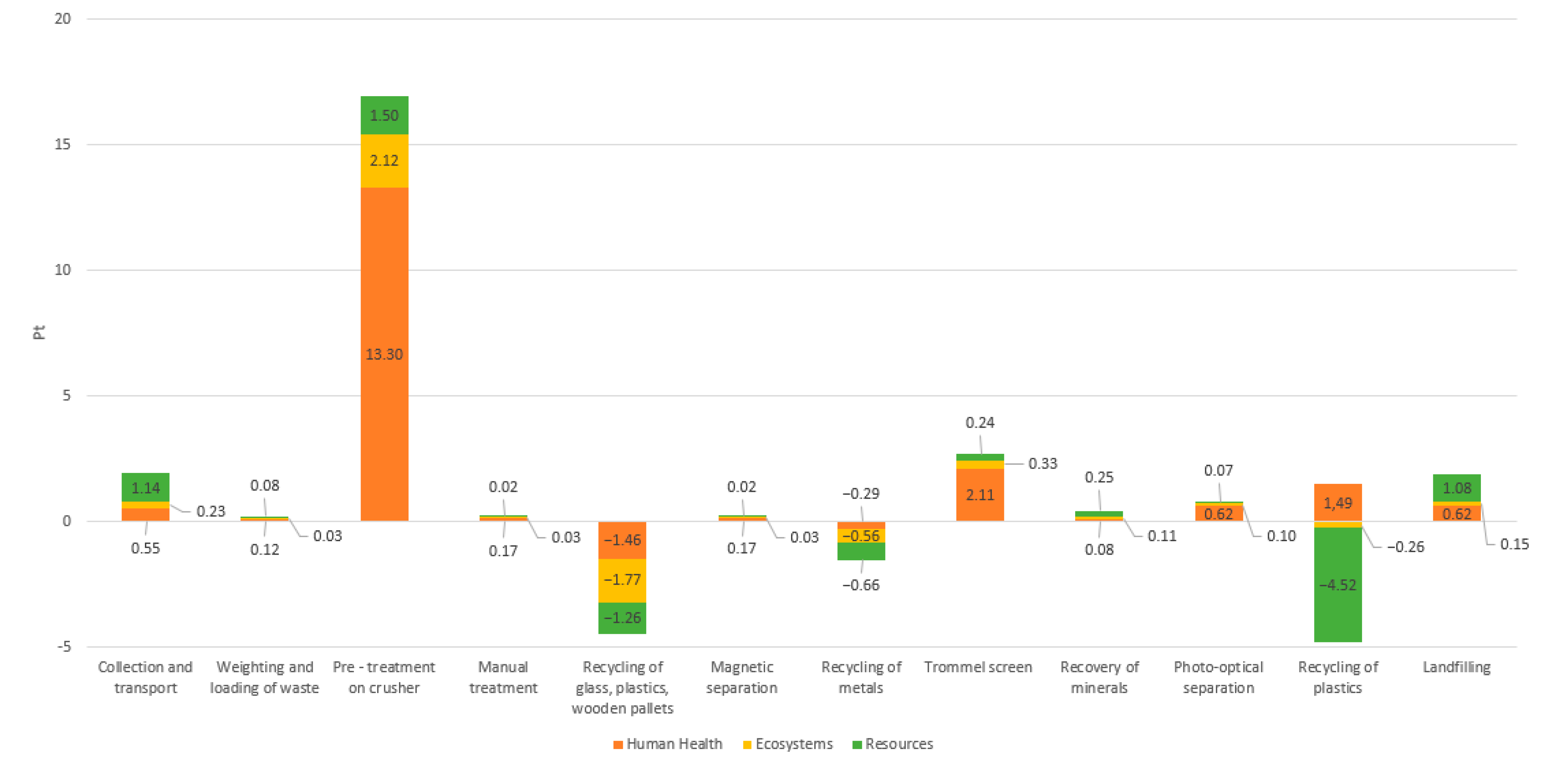 - The most burdensome stage is waste crushing (treatment involving a crusher), which is consistent with the results for all three analyzed installations. This stage is a critical link in terms of the environment. In subsequent analyses, the possibility of discontinuing this device usage within certain limits should be considered.