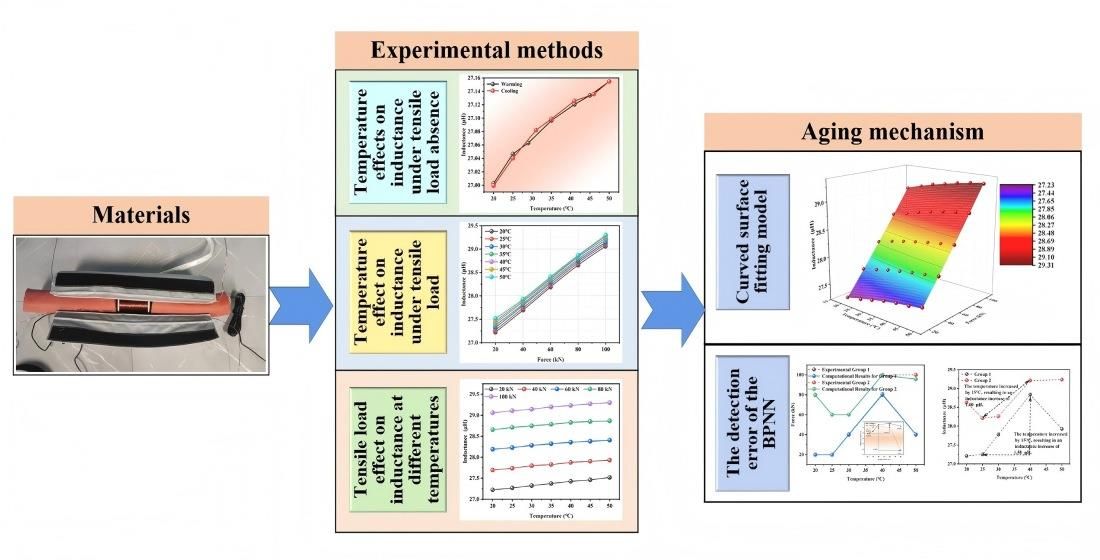 2 > 0.99), which validated inductance as a precise indicator of tensile state. The measured force sensitivity of 0.025 μH/kN demonstrated robust performance across the specified thermal range, demonstrating the proposed method’s reliability for structural health monitoring applications.