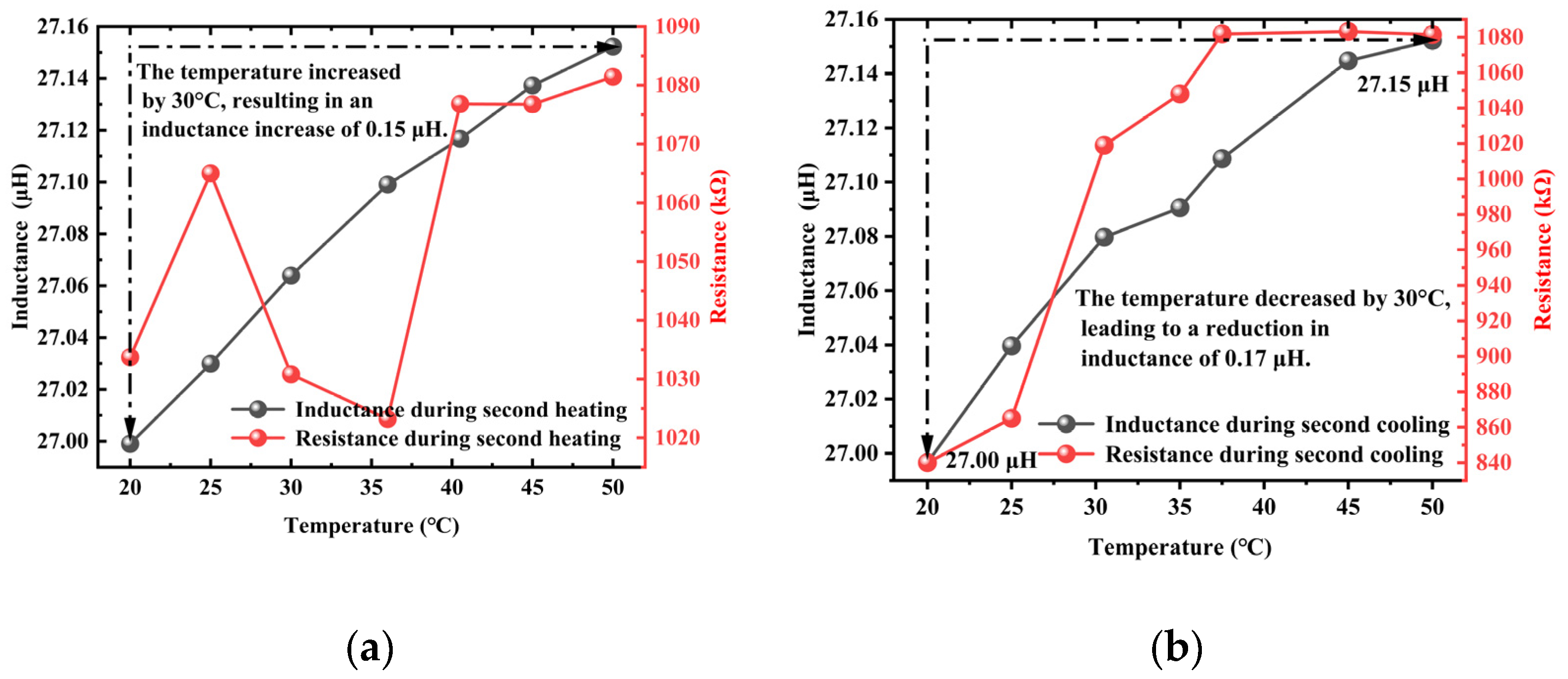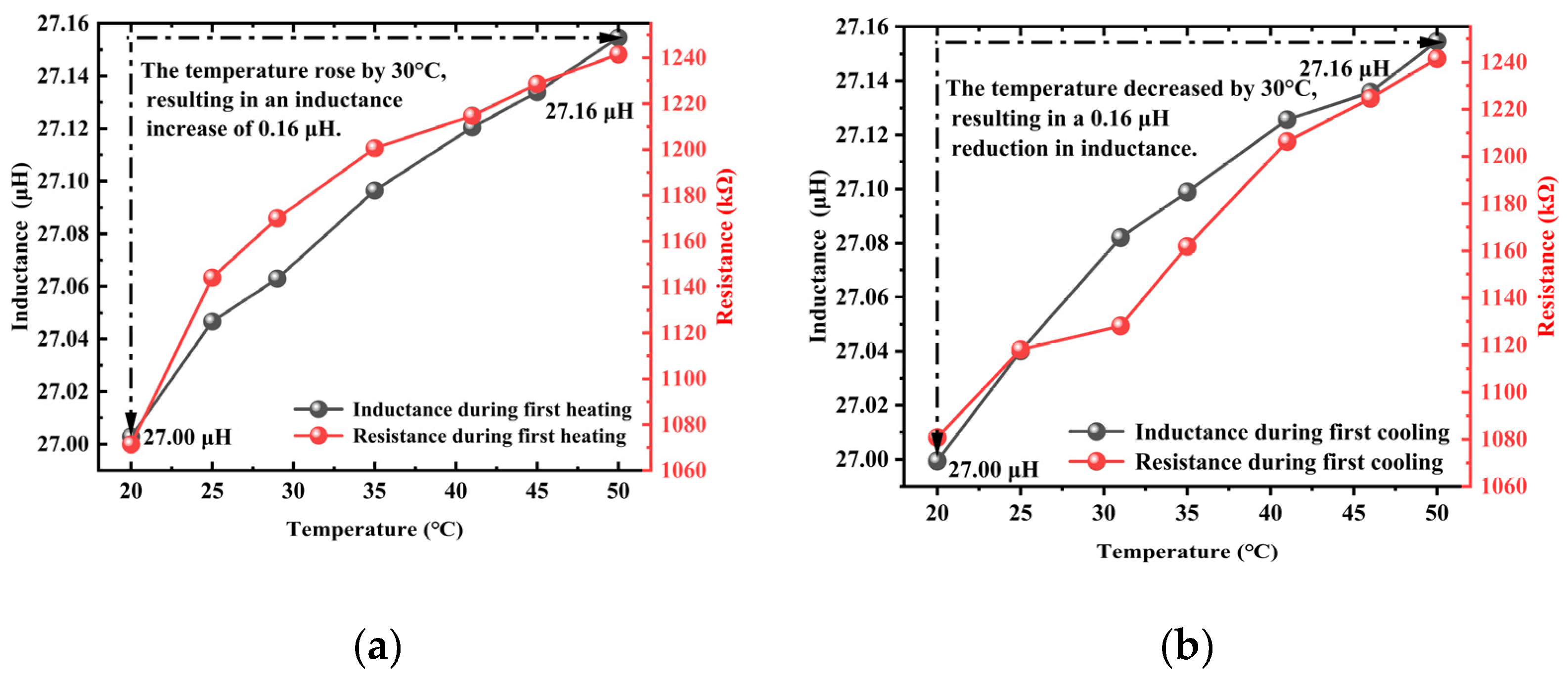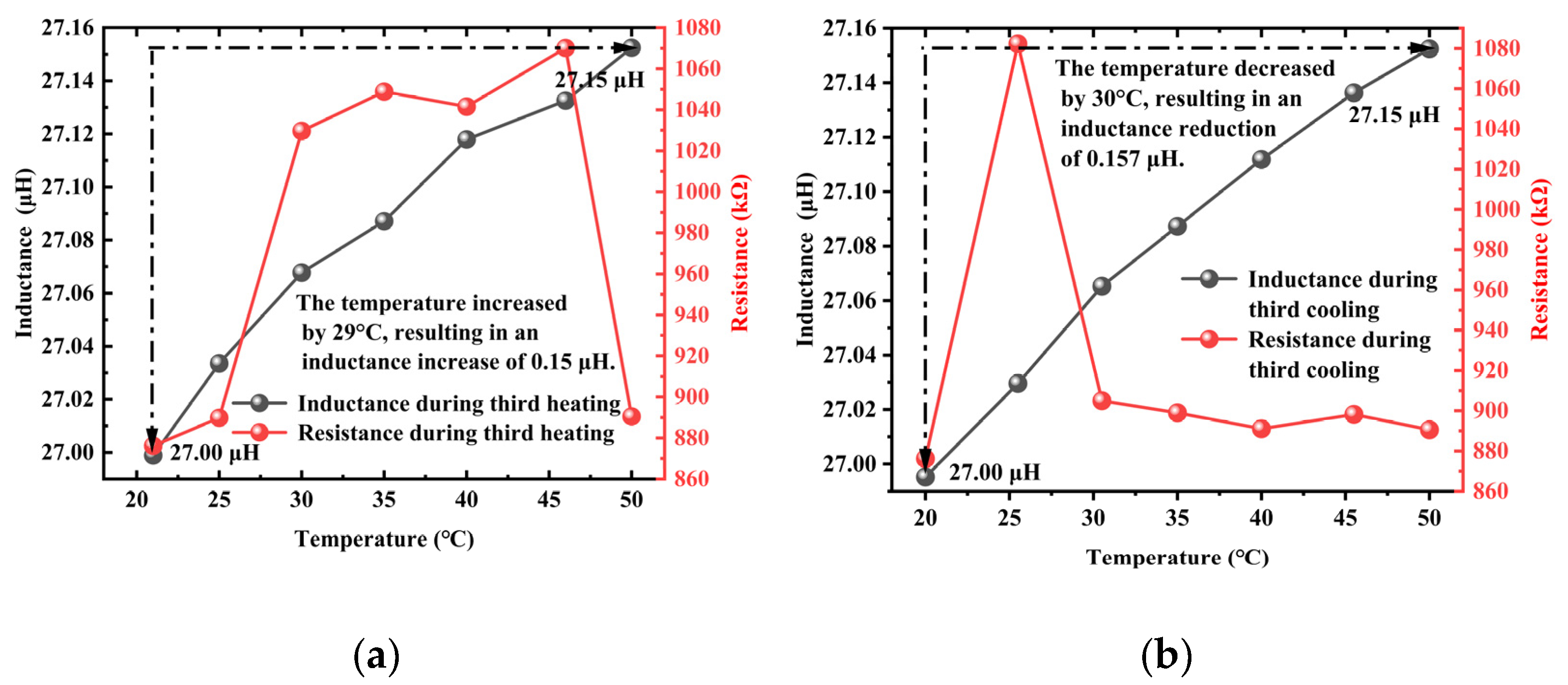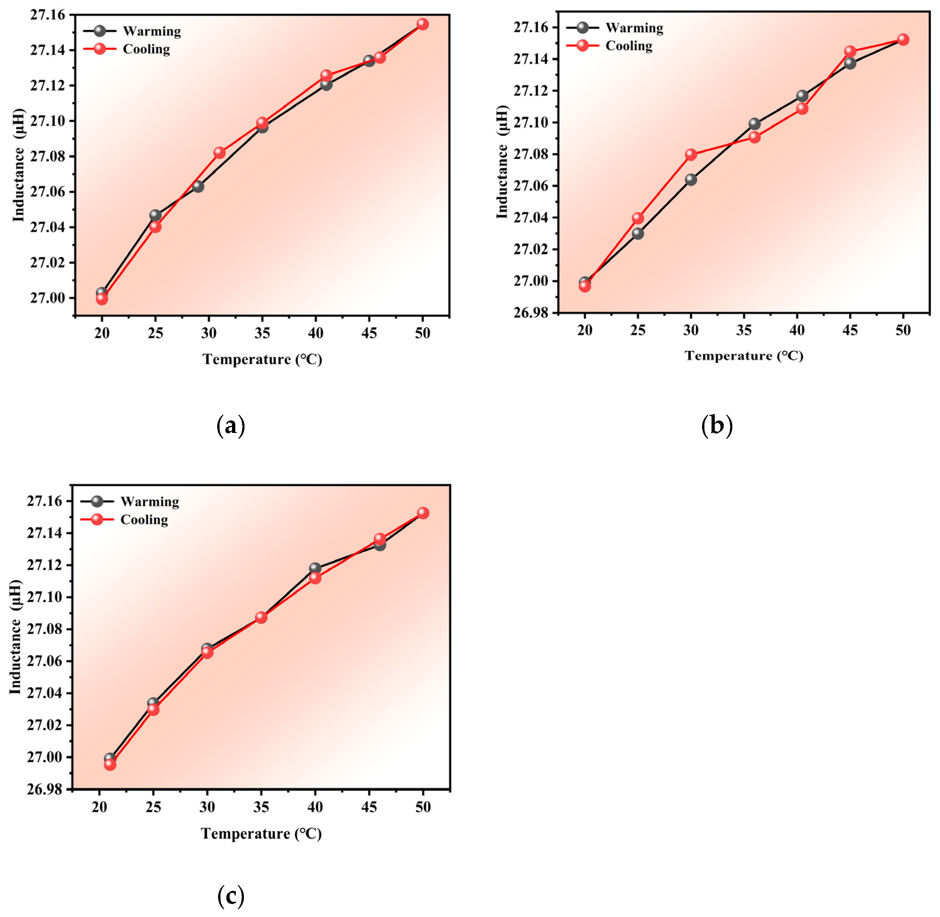 Figure 8b, the inductance value demonstrated a consistent decreasing trend with temperature reduction across all experimental trials, exhibiting three distinct characteristic regions. The inductance variations in the three tests followed a specific pattern of first decreasing, then increasing, and finally decreasing again. Notably, at 40 °C, the observed inductance variation reached 0.017 μH. The experimental data further revealed that a 30 °C temperature decrease corresponded to an inductance reduction of 0.16 μH.
