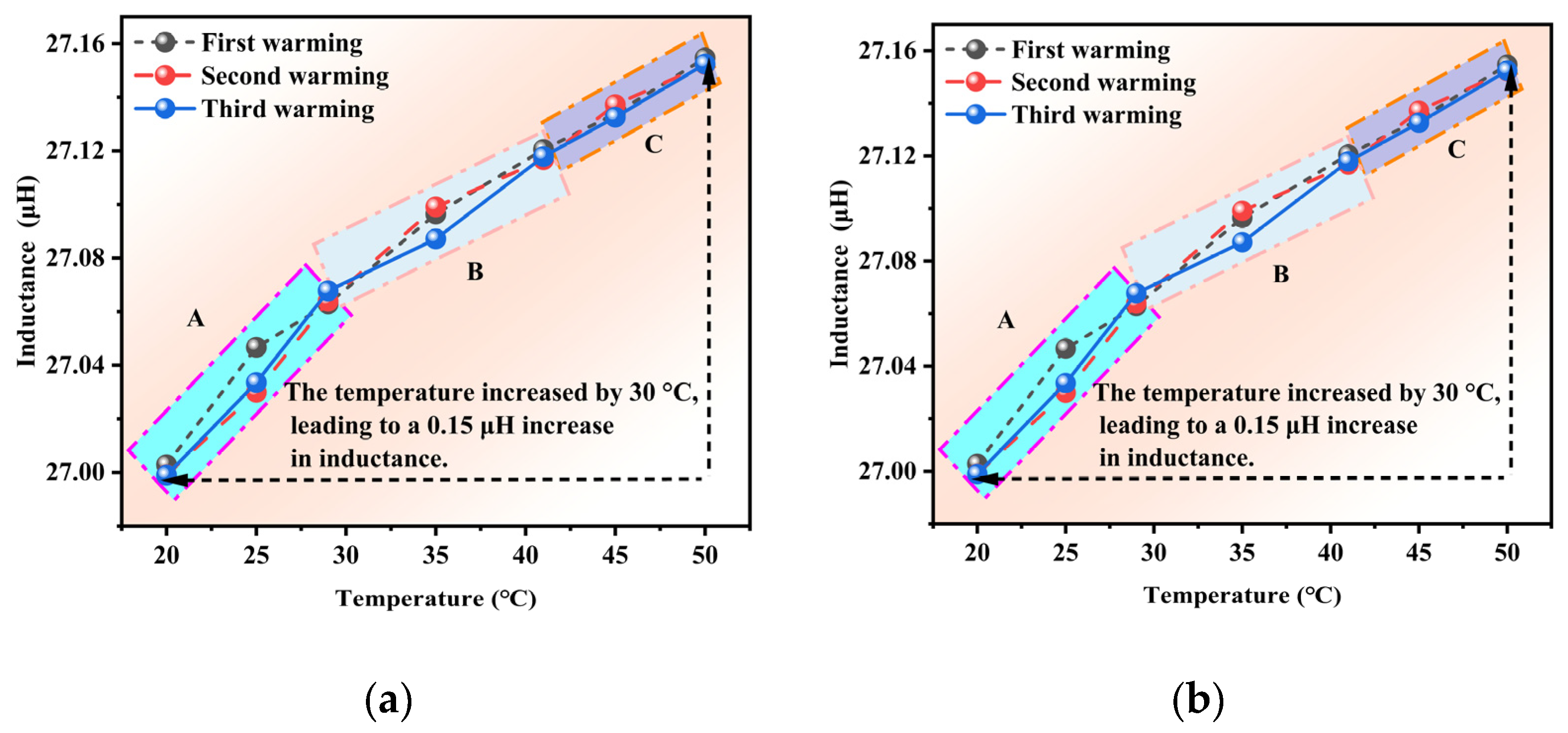 Figure 8a, the inductance value increased with the temperature across all experimental trials and could be categorized into three distinct regions. Based on the difference in inductance values between the three experiments, the variation with temperature can be divided into three regions: A, B, and C. The differences in inductance value between the three tests were as follows: Region A (0.017 μH) > Region B (0.012 μH) > Region C (0.005 μH). A 30 °C temperature increase produced a 0.15 μH. The experimental results revealed distinct temperature-dependent inductance characteristics across the three defined regions. Region A exhibited the most pronounced inductance variations, which could correspond to the temperature-sensitive zone of either the magnetic core’s permeability or the conductor’s resistivity. In contrast, Region C demonstrated significantly attenuated variations, indicating stabilization of both the material properties and structural deformation in this region. In addition, increased conductor resistivity, particularly in copper windings, enhanced the skin effect, reducing effective conduction area and consequently increasing the equivalent inductance. Furthermore, thermal expansion induced micro-deformations in the coil formers and windings, thus modifying inter-turn capacitance and magnetic circuit air gaps, which jointly affected inductance parameters. The non-uniform temperature distributions generated localized stress variations that exacerbated inductance dispersion.