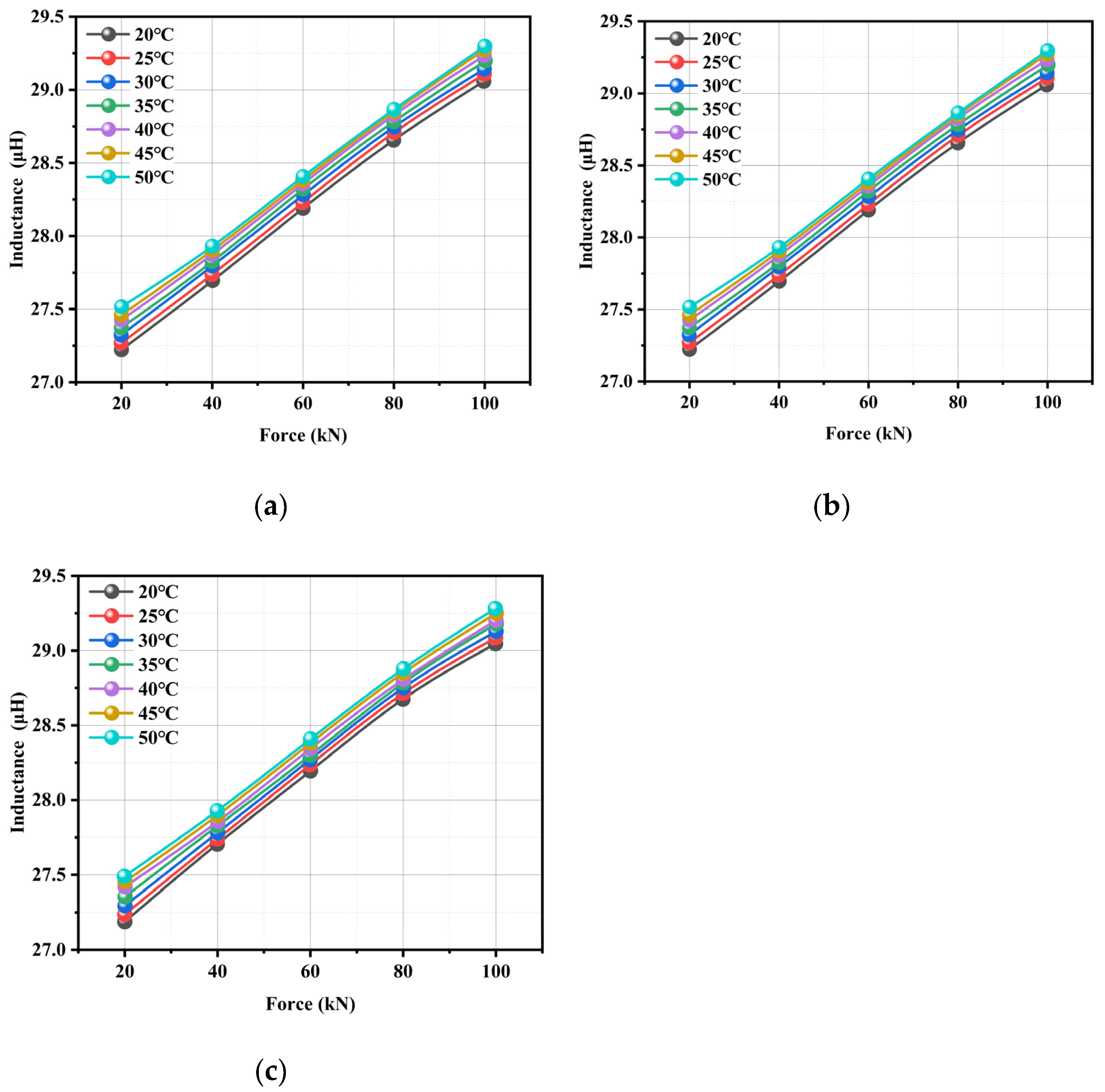 Under isothermal conditions, the steel cable’s inductance had a well-defined linear relationship with the applied tensile force, which was characterized by a systematic increase in inductance with increasing load. The experimental results revealed that limited temperature variations had a minimal influence on the inductance value; this was demonstrated by the essentially parallel nature of inductance-force curves across different temperature gradients. The observed parallel shift in inductance–force curves across temperature gradients—indicative of minimal temperature–load coupling—can be attributed to multiple underlying mechanisms. Firstly, the influence of mechanical load operates predominantly through the magnetoelastic effect, where stress alters magnetic permeability via domain rotation and deformation-induced anisotropy. In contrast, temperature impacts inductance mainly through thermal expansion and changes in intrinsic magnetic properties such as saturation magnetization. These mechanisms function largely independently, leading to additive rather than coupled effects. Secondly, within the studied range (20–50 °C), both the thermal expansion of materials and the stress-induced changes in magnetic permeability exhibit approximately linear behavior. The superposition of these linear responses results in a parallel displacement of the curves with temperature, without significant slope variation. Thirdly, the sensor structure is designed to limit nonlinear interactions at material interfaces; thermal expansion does not substantially disrupt stress distributions caused by axial loading. Finally, the operating temperatures remain well below the Curie point of the ferromagnetic material, ensuring stable and reversible magnetic responses without irreversible transitions. This decoupling facilitates straightforward temperature compensation in practical applications. This parallelism confirmed the absence of significant force–temperature coupling effects in the electromechanical response.