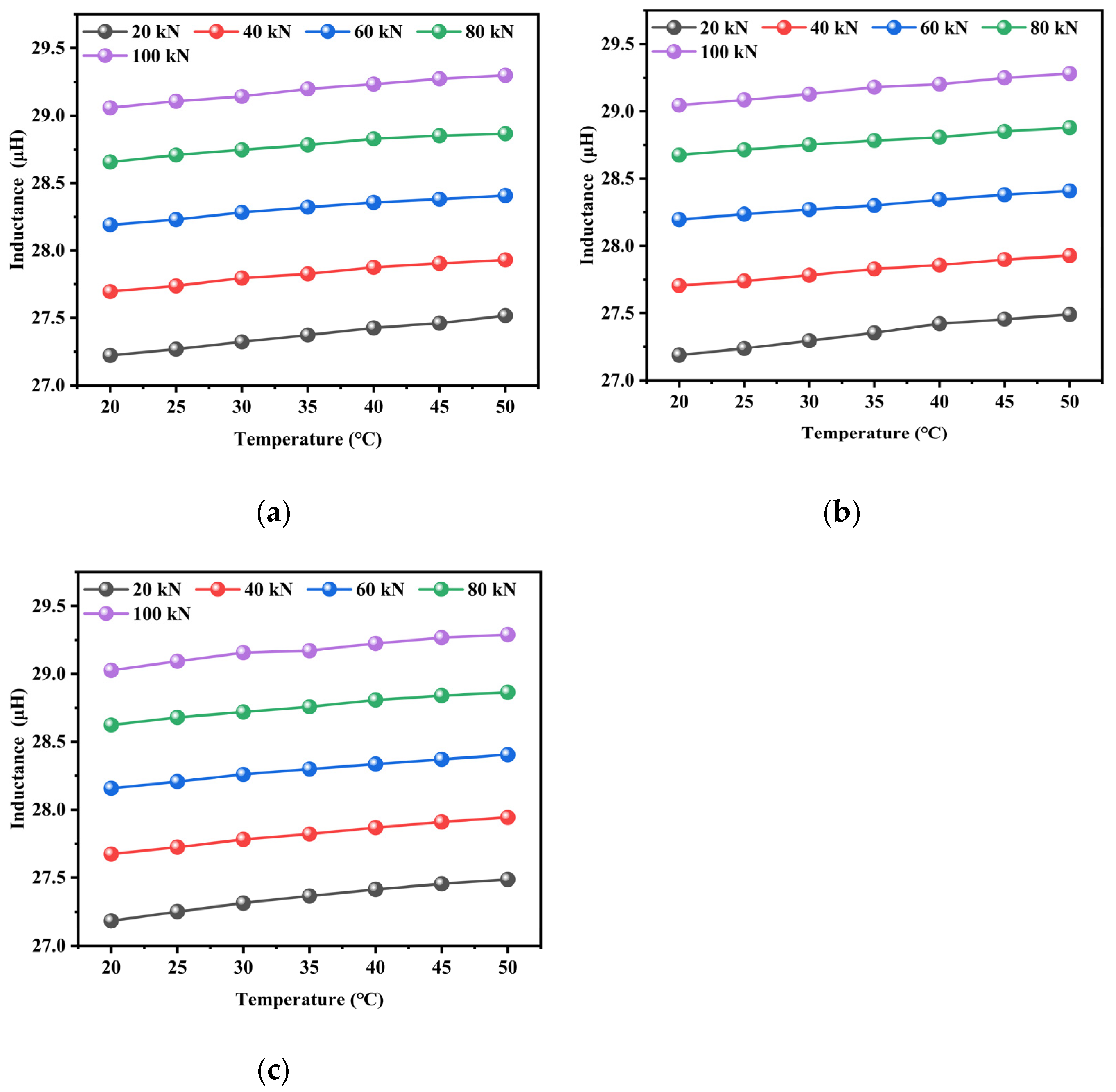 Figure 10, where it can be seen that the inductance value showed a significant increasing trend with the temperature. Under a constant tensile load of 20 kN, a 250% temperature increase resulted in an inductance increment of 0.26 μH. Particularly, the incremental change in inductance between adjacent temperature intervals exhibited a progressive attenuation with continual temperature increase, and a consistent pattern was observed across various tensile load conditions. The enhanced domain wall mobility caused by thermal activation increased material permeability. Thermally induced geometric dimensional changes in the steel cable were observed, as well as high-temperature relaxation of internal residual stresses that modified domain alignment configurations. The observed reduction in the inductance increment at elevated temperatures indicated that the steel cable was approaching magnetic saturation. Under such conditions, the enhancement effect of the domain wall motion progressively stopped, reducing the rate of inductance variation. The experimental results exhibited excellent reproducibility, and the three tests demonstrated high consistency, with a relative deviation of up to 2.5%. This robustly validated both the reliability and repeatability of the electromagnetic response-based method for axial load detection in steel cables. These findings provide critical insights for temperature-compensated force sensing applications in structural health monitoring systems.