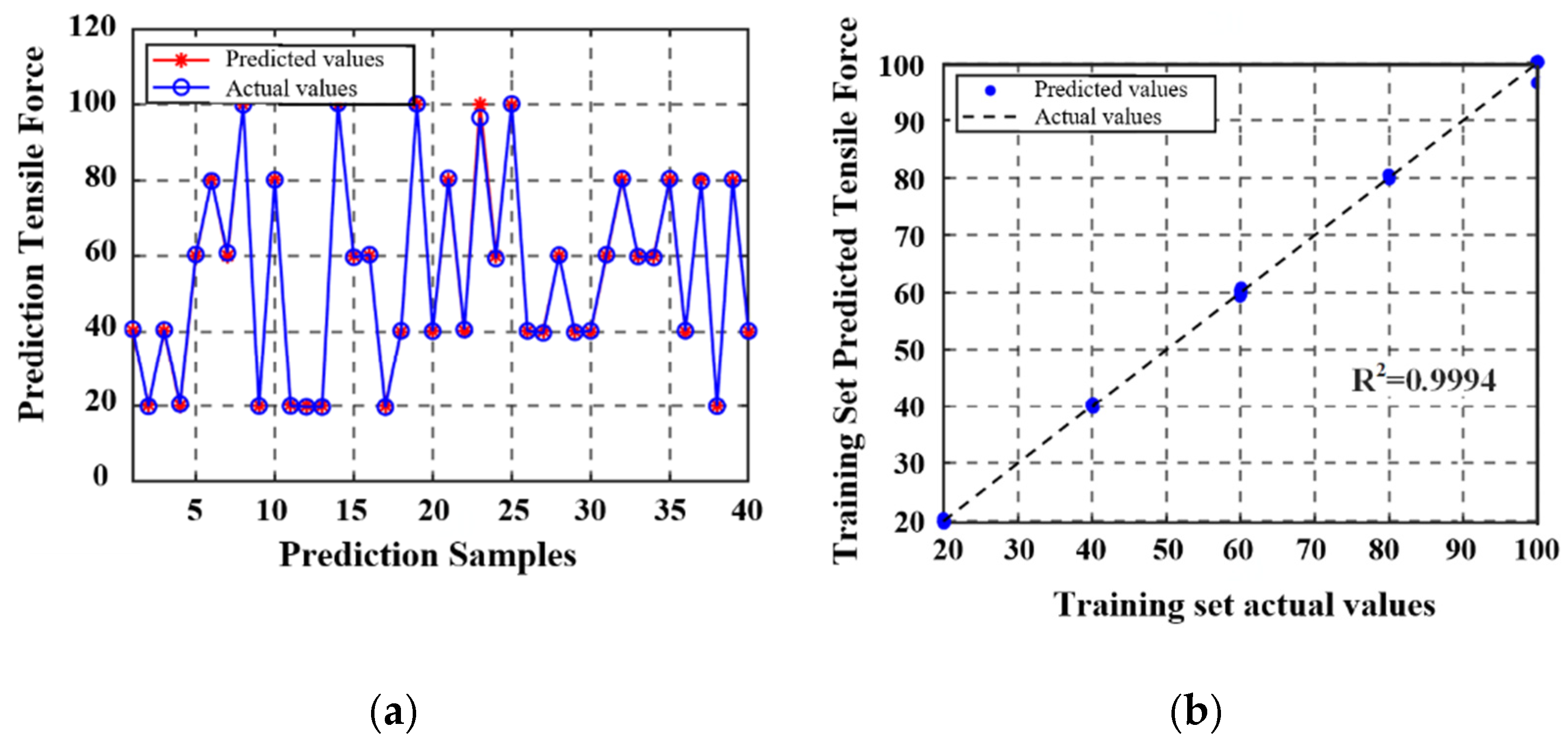 The complete dataset included 140 sets of temperature, inductance, and tensile load measurements and was partitioned into training and testing subsets. Namely, 100 samples were allocated for model training, and the remaining 40 samples were used for independent validation. After model development and evaluation, the prediction performance of the proposed model was visually assessed using comparison plots. The correlation between the predicted and actual values in the training set is presented in