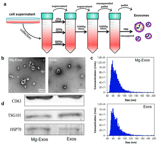 Isolation and characterization of Mg-Exos. (a) Schematic illustration of exosome isolation. (b) Representative TEM images of Exos. (c) Particle concentration and size distribution of Exos were determined via NanoFCM. (d) WB analysis of exosome surface markers CD63, TSG101, and HSP70. n = 3.