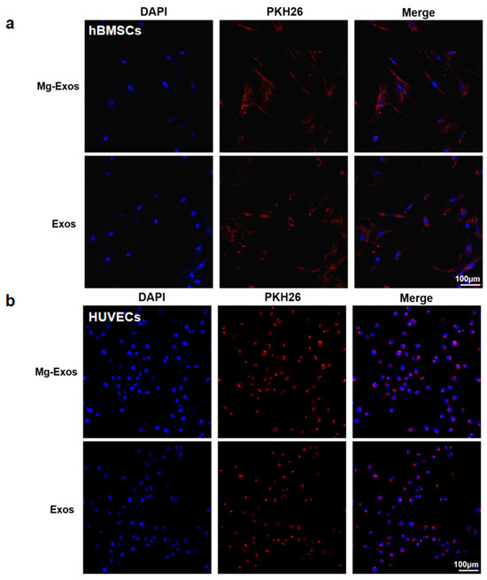 Mg2+ plays important roles in promoting new bone formation and maintaining vascular function, which also contributes to the restoration of blood supply and bone regeneration in SONFH [41,42,43,44]. However, previous studies have primarily focused on the direct effects of Mg2+ or Mg-containing scaffolds on cells such as BMSCs, while the regulatory effects of Mg2+ stimulation on the functions of exosomes derived from BMSCs remain unexplored. Studies have indicated that 10 mM Mg2+ caused no significant toxicity in BMSCs and exerted the most potent effect in promoting the osteogenic differentiation of BMSCs and upregulating the expression of VEGF [45,46]. In addition, 10 mM Mg2+ stimulation optically lowered the anti-angiogenic functionality of macrophage-derived exosomes. Therefore, in this study, rBMSCs were treated with 10 mM MgCl2 for 48 h to collect exosomes (designated as Mg-Exos) from the culture supernatant via ultracentrifugation (Figure 2a). Exosomes isolated from untreated BMSCs were designated as Exos. TEM images revealed that the two types of exosomes exhibited cup-shaped or spherical morphologies, with diameters ranging between 50 nm and 150 nm (Figure 2b). NanoFCM indicated that the particle sizes of the two types of exosomes were similar, predominantly distributed within the range of 50–120 nm, with a peak around 60 nm, and the concentrations of the isolated exosomes were approximately ×109 particles/mL for both groups (Figure 2c). Western blot analysis confirmed that both exosomes expressed the specific exosomal markers CD63, TSG101, and HSP70 (Figure 2d). To detect the internalization of exosomes by cells, the two exosomes were labeled with PKH26 and then co-cultured with BMSCs and HUVECs, respectively. Fluorescence microscopy observation showed that the labeled exosomes exhibited homogeneous red punctate fluorescence, which was successfully taken up by BMSCs and HUVECs (Figure 3a,b).