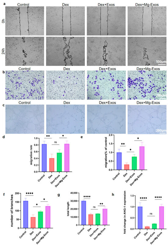 Mg-Exos promoted angiogenesis of HUVECs. (a,b) Representative images and quantitative analysis of migration of HUVECs determined by wound healing assay (a,d) and transwell assay (b,e). Images (c) and quantitative analysis (f,g) of tube formation. mRNA expression level of ANG-1 (h). * p < 0.05, ** p < 0.01, **** p < 0.0001, ns: no significant. n = 3.