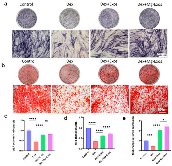 Mg-Exos promoted osteogenesis of BMSCs. Images (a) and quantitative analysis (c) of ALP staining of BMSCs after 14 days of osteogenic induction. Images (b) and quantitative analysis (d) of ARS staining of BMSCs after 21 days of osteogenic induction. (e) mRNA expression level of Runx2. * p < 0.05, *** p < 0.001, **** p < 0.0001, ns: no significant. n = 3.