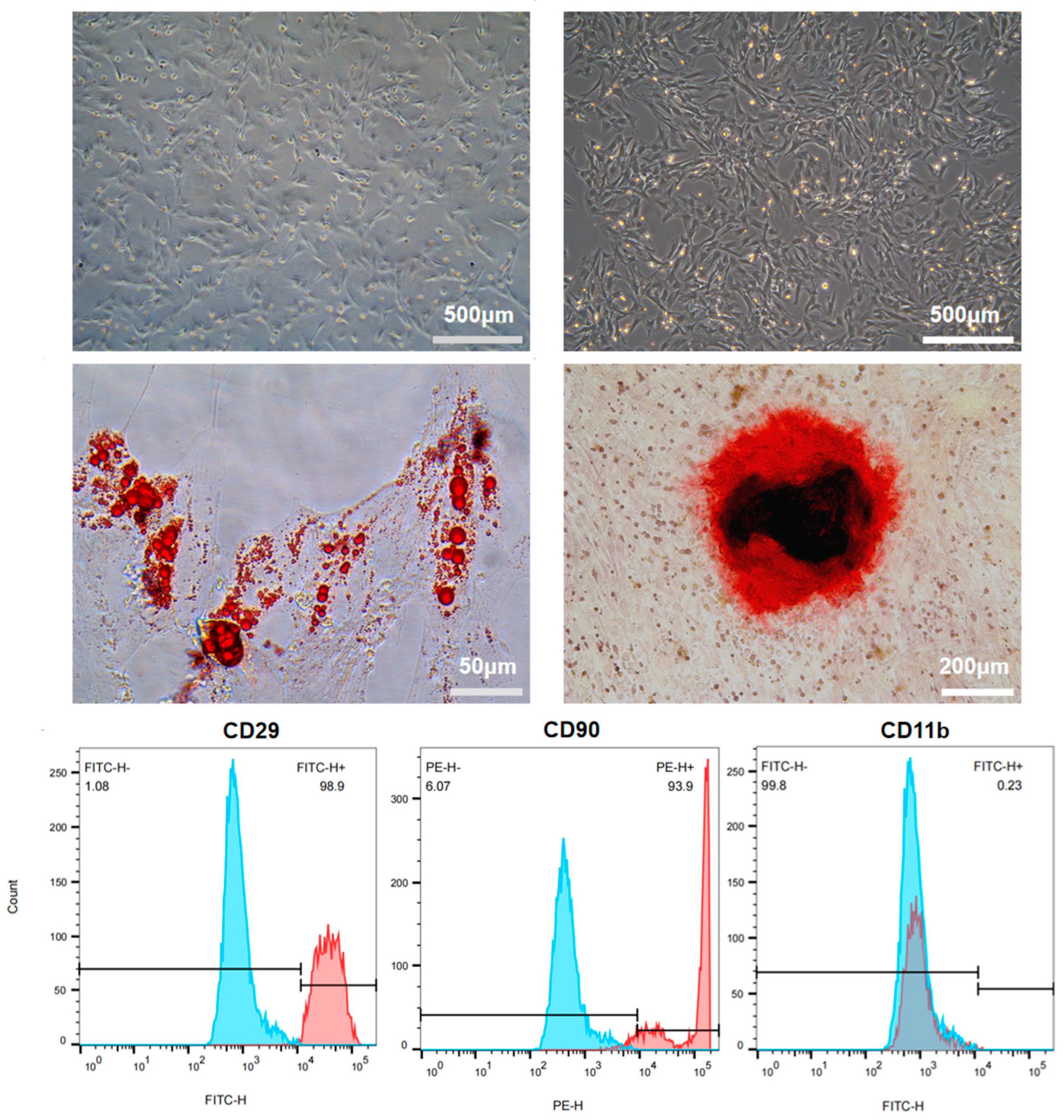 Figure 1. Characterization of rBMSCs. (a,b) Morphology of rBMSCs of the P1 generation (a) and P5 generation (b). (c) Oil Red O staining of adipogenically induced rBMSCs. (d) Alizarin Red S staining of osteogenically induced rBMSCs. (e) Flow cytometry of the cell surface marker on rBMSCs. The control group was presented as the blue curve and the test groups were presented as red curves.