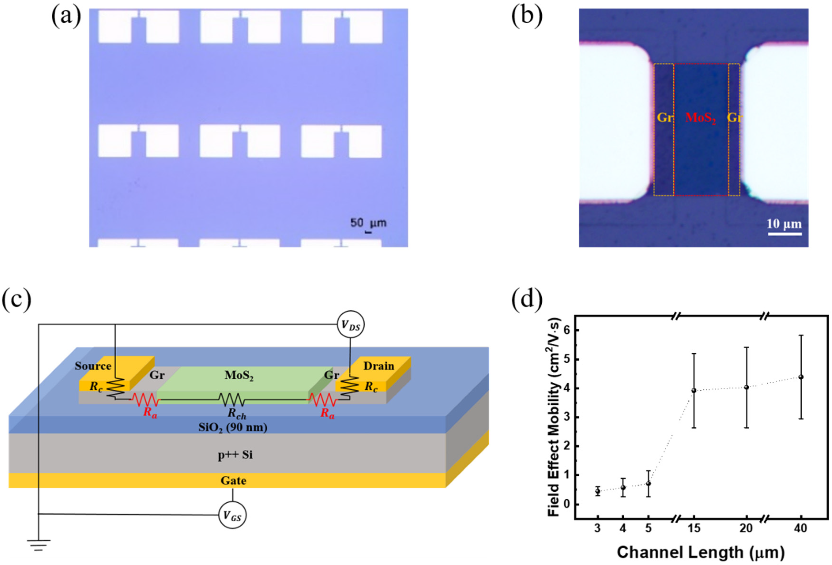 - Ngo, T.D.; Huynh, T.; Jung, H.; Ali, F.; Jeon, J.; Choi, M.S.; Yoo, W.J. Modulation of Contact Resistance of Dual-Gated MoS2 FETs Using Fermi-Level Pinning-Free Antimony Semi-Metal Contacts. Adv. Sci. 2023, 10, 2301400. [Google Scholar] [CrossRef]