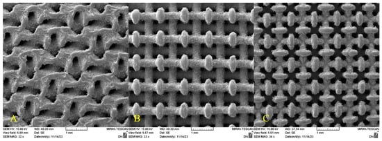 Detail of the used samples structures—scaffold types (A) gyroid, (B) diamond large, (C) diamond small.