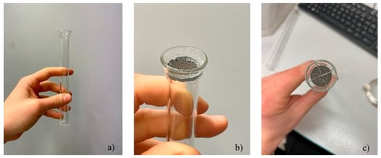 Samples 1–4 were made using the vacuum pump and technically pure zinc melt. The 3D-printed Ti-4Al-6V scaffolds without the solid backs were attached to the pump by connecting a piece made from glass, as seen in the Figure 2. To this glass piece, the scaffolds were attached either with the use of the fire-resistant silicate-based glue Technicqll or using a fine silver wire with copper filling. Suction was conducted from a melt temperature 480 °C, and the melt was cleaned by pouring into another crucible before infiltrating samples 3 and 4.