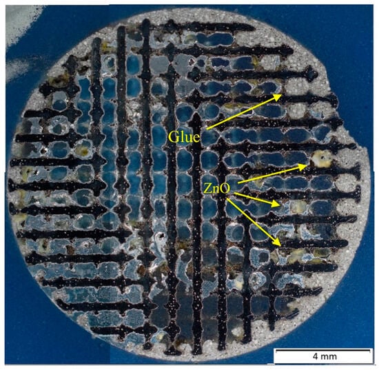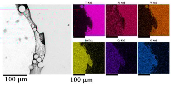 Samples prepared by the vacuum suction were quite similar to each other in the matter of microstructure. Quite a considerable amount of oxidic inclusions was observed in the microstructure of all samples, even in samples where the melt was cleaned before the infiltration. Zinc oxides were mainly found at the contact surfaces with the titanium reinforcement, which can be seen in the EDS map in Figure 7.
