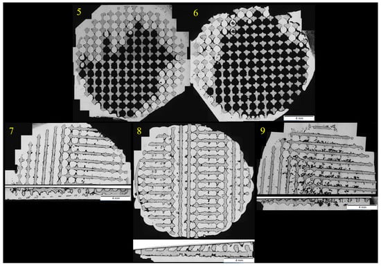 The centrifugal casting method granted more infiltrated samples. All of them are shown in Figure 5. Samples positioned in a vertical direction in relation to the axis of rotation were fully infiltrated, regardless of the presence of the solid back part of the samples. By contrast, the results of horizontally positioned samples varied, depending on the presence of the solid back parts. Sample 7, which had its back cut off, was fully penetrated, unlike the same positioned samples 5 and 6, which had their solid backs (their infiltration success rate was 41.24% and 24.60%). Vertical axis centrifugal casting method seems to be the most suitable method, because it does not need porous material only to fully infiltrate—both sample 8 and 9 were fully infiltrated. This makes it suitable for practice, where it is expected to produce an implant with porous structure on the surface and a non-porous core.