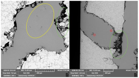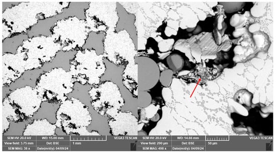 For sample 9, higher porosity was observed despite full infiltration than for the other samples prepared by centrifugal casting. The melt was apparently not perfectly cleaned. The oxide inclusions were most likely pulled out of the sample structure during the surface treatment process to leave behind specifically shaped pores (Figure 12). Residual oxides are labelled with red arrow.
