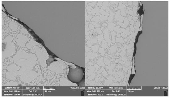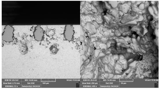 Traces of pulled out incoherent reinforcement sections were also observed in the vertical section through the sample. These, unlike the inclusion marks, are regularly spaced and rounded, as observed in Figure 13. The incoherence of the material in this case is probably due to insufficient fusion of the material during the manufacture of the reinforcement.