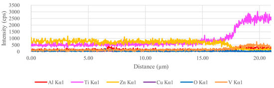 Samples 5 and 6 were significant because of the different microstructure of the zinc alloy near the contact surfaces with the titanium reinforcement. EDS elemental mapping in this area does not indicate the formation of intermetallics, as seen in Figure 9. In between the titanium balls on the surface of the reinforcement, the melt probably cooled more quickly and thus formed a finer structure. In the microstructure of sample 7, this finer structure was not observed. In addition, the EDS linescan was performed at the point of direct contact between the matrix and the reinforcement, which did not show the presence of a brittle intermetallic phase.
