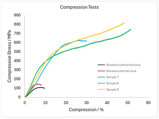 The results of uniaxial compression tests are highly distorted and scattered due to the non-standard dimensions of the samples and the geometry of the scaffolds. Therefore, it is not possible to compare them with the data from the literature (see the first two rows of Table 2), only to compare the test result of the specimen and the corresponding uninfiltrated scaffold standard. The typical compression curves are given in Figure 14. The initial uninfiltrated samples taken as a standard were cut (i) fully in the porous part (labelled as standard without the back) or (ii) at the boundary between porous scaffold and bulk (labelled as standard with the back). Their comparison illustrates the influence of porosity fraction on mechanical properties and as expected, the sample with mixed (porous and bulk) structure reached higher values of compressive stress. For samples 7 (infiltrated in horizontal position) and 8 (infiltrated in vertical position), the standard is without the back, non-porous part, for sample 9 (infiltrated in vertical position) it is the standard with the back. However, even from these very scattered results, an improvement in the mechanical properties of the zinc alloy infiltrated specimens compared to the uninfiltrated scaffold standards can be observed, especially in terms of yield strength and ultimate strength.