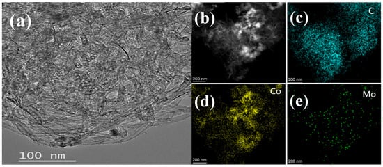 (a) TEM images of Co1Mo0.1/CNTs and (b–e) STEM-EDS of elemental mapping image, C, Co, and Mo, respectively, for Co1Mo0.1/CNTs.