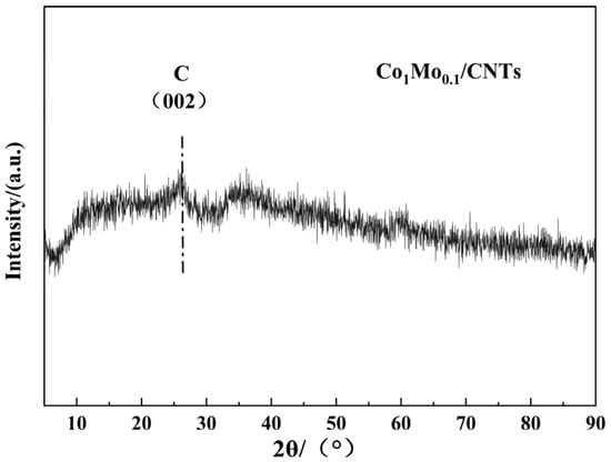The as-synthesized Co1Mo0.1/CNTs was systematically characterized by TEM, STEM-EDS, XRD, XPS, and FT-IR techniques. Figure 1a demonstrates that nanoparticles were successfully and uniformly loaded onto the carbon nanotubes. This indicates that the loading process had good consistency. Elemental mapping via STEM-EDS shown in Figure 1c–e indicates that C, Co, and Mo elements achieved relatively stable and uniform dispersion within the material. This significant finding confirms that Co and Mo elements were successfully attached to the carbon nanotubes. Moreover, the EDS analysis revealed a Co/Mo atomic ratio of 91:9 and a Co loading of 0.45 wt% on CNTs, closely matching the theoretical value, thereby confirming the precise synthesis control of Co1Mo0.1/CNTs. The XRD pattern (Figure 2) exhibits a distinct reflection at 26.43° associated with the crystallographic plane of (002) for carbon, while no discernible diffraction peaks for crystalline Co or Mo phases are observed. This suggests that the metallic components likely exist in non-crystalline or amorphous forms [19]. The absence of sharp metal-related diffraction peaks may be attributed to either the nanoscale dimensions of the metallic species or their non-crystalline nature, both of which typically result in weakened XRD signals.