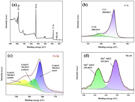 The chemical states of Co and Mo in the catalyst were thoroughly investigated through XPS analysis (Figure 3). All spectra were calibrated by setting the C 1s peak to 284.00 eV (graphitic carbon). Through careful deconvolution of the high-resolution Co 2p and Mo 3d spectra, we precisely determined the valence states and relative abundances of these elements. Figure 3a presents the XPS overall spectrum, which reveals the types of elements present in the catalyst. The peaks located at 780.93, 531.84, 284.00, and 232.26 eV in the spectrum are attributed to Co 2p, O 1s, C 1s, and Mo 3d, respectively. The C 1s spectrum from Figure 3b displays two contributions at 284.00 and 284.53 eV, assigned to C-C and C=O of C. In the Co 2p [8] region of Figure 3c, the main peak at 780.93 eV is characteristic of the Co 2p3/2 metal state and the main peak at 782.65 eV is representative of the Co 2p3/2 oxidized state [20]. Additionally, the peak observed at 786.58 eV corresponds to the satellite peak of these principal peaks. After deconvolution of the Co 2p XPS peaks and correction with sensitivity factors, the surface metallic cobalt accounts for 60.72% and Co2+ for 39.28%. The Mo 3d spectrum in Figure 3d shows doublet peaks at 232.26 (3d5/2) and 235.40 eV (3d3/2), indicative of the Mo6+ of MoO3. The presence of these characteristic peaks provides direct evidence of the chemical state of Co and Mo. By comparison with the standard spectra Co at 778.2 eV and Mo6+ 3d at 233.1 eV, the Co 2p binding energy showed a positive shift, while that of Mo 3d was negatively shifted. This phenomenon may stem from the electronic interaction between molybdenum and cobalt, where the high electronegativity of molybdenum may draw more electron density, thereby affecting the electronic environment of cobalt and causing its binding energy to increase. Conversely, the decrease in molybdenum’s binding energy could be due to its lower oxidation state or different chemical environment in the compound compared to cobalt.