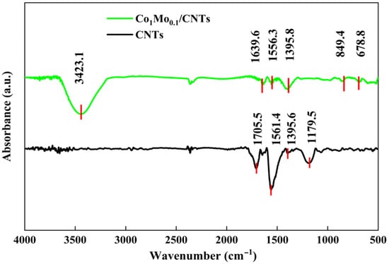 The FT-IR spectrums of Co1Mo0.1/CNTs and CNTs are shown in Figure 4. The absorption peak observed at approximately 3423.1 cm−1 is associated with O–H stretching of water molecules adsorbed on the surface during the preparation of Co1Mo0.1/CNTs. The peaks at 678.8 cm−1 may arise from Co–O bonds [21], while the peak at about 849.4 cm−1 is likely due to Mo–O–Mo vibrations of MoO3 in the Co1Mo0.1/CNTs composite [22]. Peaks around 1705.5 and 1639.6 cm−1 correspond to C=C stretching, and those at 1561.4 and 1556.3 cm−1 are assigned to C=O stretching [23]. The features at 1395.6, 1179.5, and 1395.8 cm−1 are indicative of carboxyl (COOH-) groups [24]. The difference in transmittance for C=O and carboxyl between Co1Mo0.1/CNTs and CNTs may result from the interaction of C=O with H+, OH−, and free oxygen in water to form carboxyl groups [25].