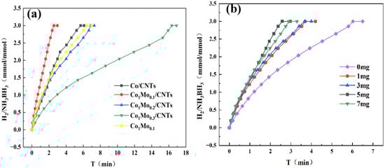 Ammonia borane (NH3BH3, AB, 97%, Aldrich, St. Louis, MO, USA), sodium borohydride (NaBH4, 99%, Aldrich, St. Louis, MO, USA), cobalt chloride hexahydrate (CoCl2∙6H2O, 99%, Tianjin Bo di Chemical Co., Ltd., Tianjin, China), sodium molybdate dihydrate (Na2MoO4∙2H2O, 99%, Tianjin Chemical Reagent Factory No. 4. Tianjin, China) and multi-walled carbon nanotubes (MWCNTs, carboxylation, Shenzhen Sui heng Technology Co., Ltd., Shenzhen, China) were utilized as received. All reactions were carried out using deionized water as the solvent.