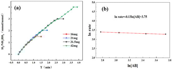 By systematically varying catalyst and AB concentrations, we determined the reaction order and gained mechanistic insight into AB hydrolysis. As demonstrated in Figure 6a, the hydrogen evolution rate exhibited a progressive enhancement with increasing catalyst concentration. Kinetic analysis in Figure 6b reveals a slope of 1.13, confirming first-order dependence on catalyst concentration. Higher catalyst concentrations supplied more active sites, enlarging the catalyst–reactant interface and accelerating the reaction. Therefore, the increase in catalyst concentration has a significant positive impact on enhancing the kinetic behavior of chemical reactions. Figure 7a reveals that hydrogen was released continuously and steadily throughout the reaction, with its generation rate almost unaffected by fluctuations in AB concentration. As shown in Figure 7b, the linear fit yields a slope of 0.13, consistent with zero-order reaction kinetics. This also indicates that the AB hydrolysis reaction was independent of the AB concentration. And the catalyst played a dominant role in the reaction. A possible reason for this is that the active sites on the catalyst surface may already have been fully occupied by AB molecules. Even if the concentration of AB had been further increased, there were no additional active sites available for adsorption; therefore, the reaction rate did not increase accordingly.