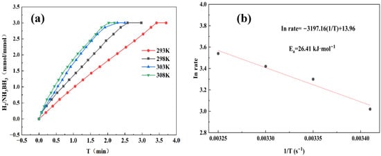 To accurately determine the activation energy (Ea) for AB hydrolysis, we performed temperature-dependent kinetic studies at 293, 298, 303, and 308 K. As seen in Figure 8a, as the reaction temperature increased step by step, the rate of hydrogen generation also increased. This phenomenon clearly indicates that higher reaction temperatures significantly promote the hydrolysis rate of AB. Through Arrhenius analysis shown in Figure 8b, the Co1Mo0.1/CNTs catalyst demonstrates a small Ea of 26.41 kJ mol−1, indicating its high catalytic efficiency for AB hydrolysis.
