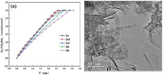 (a) Cycle stability test for hydrogen generation via AB hydrolysis catalyzed by Co1Mo0.1/CNTs adding 31.5 mg AB at 298 K. (b) TEM images of Co1Mo0.1/CNTs catalyst after five cycles.