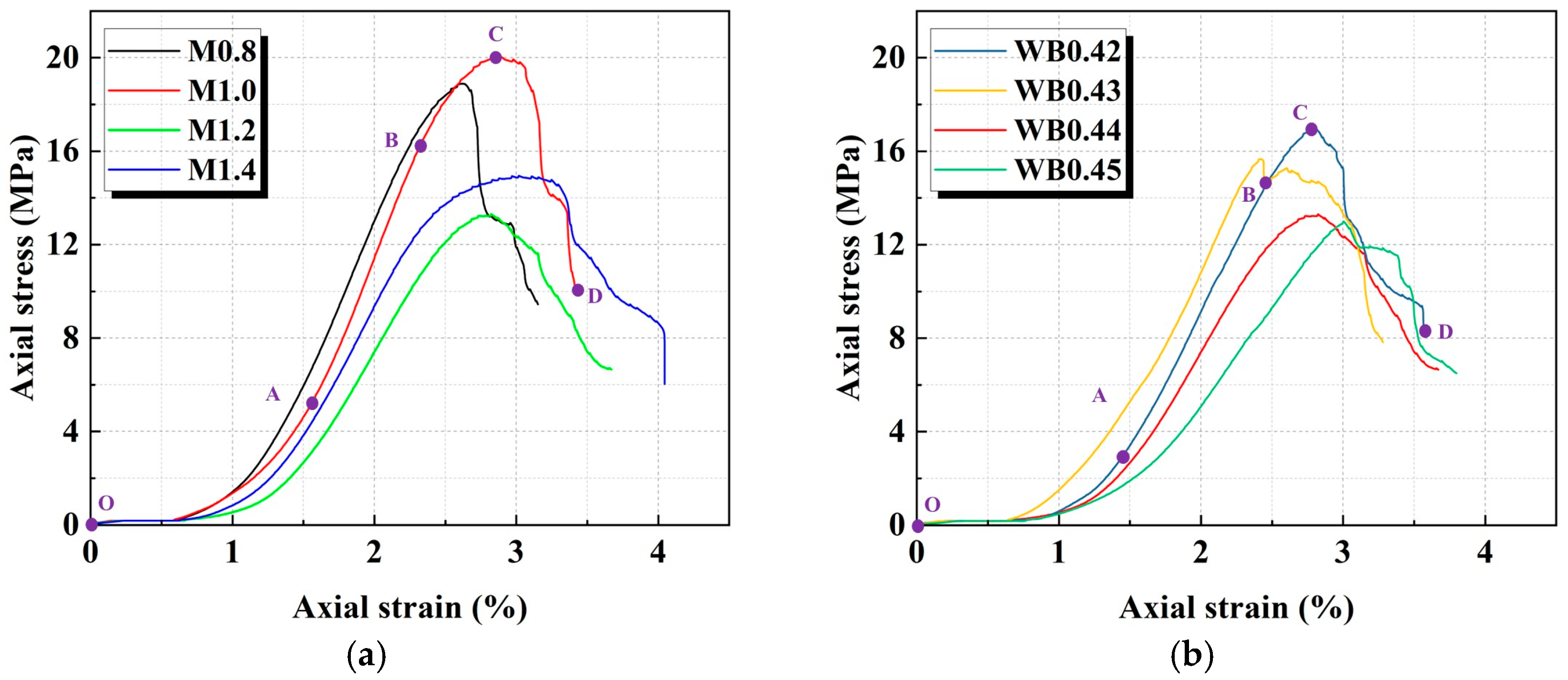 Figure 2 displays the stress–strain curves of geopolymer samples with different activator moduli and water–cement ratios. According to the studies by Che et al. [