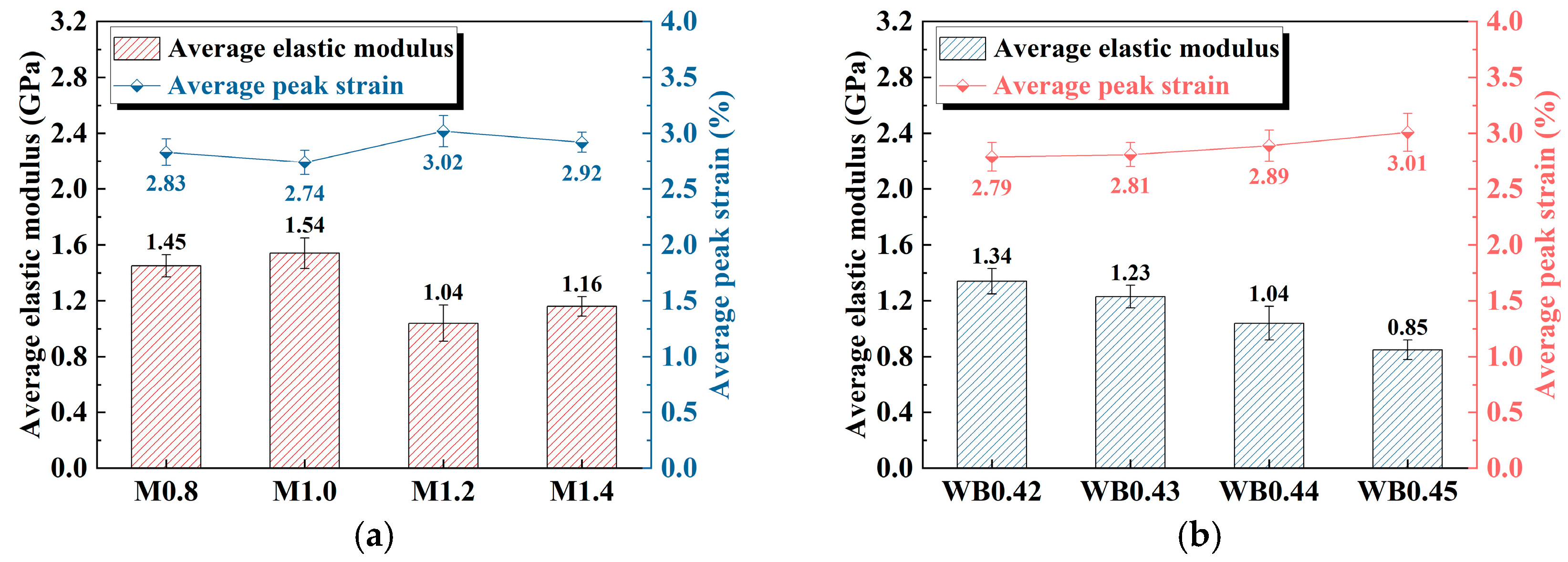 Figure 3 reveals the elastic modulus and peak strain of geopolymer samples under different activator moduli and water–binder ratios. As shown in