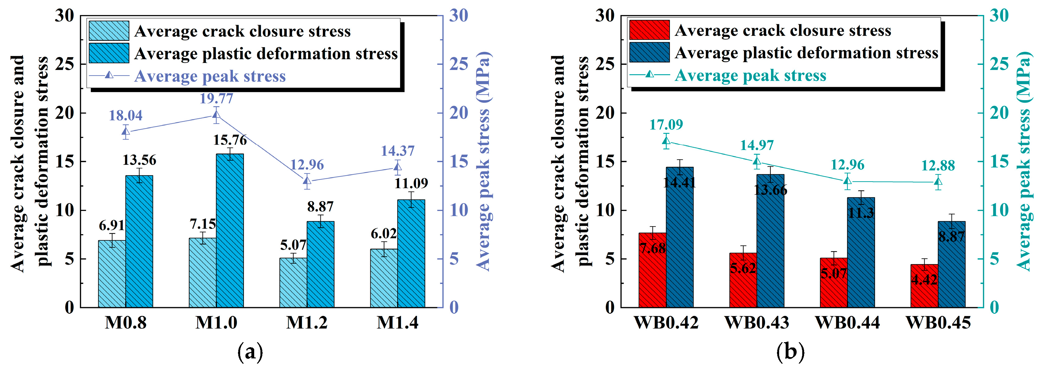 Figure 4 illustrates the peak stress, crack closure stress, and plastic deformation stress of geopolymer samples under the influence of different activator moduli and water–cement ratios.