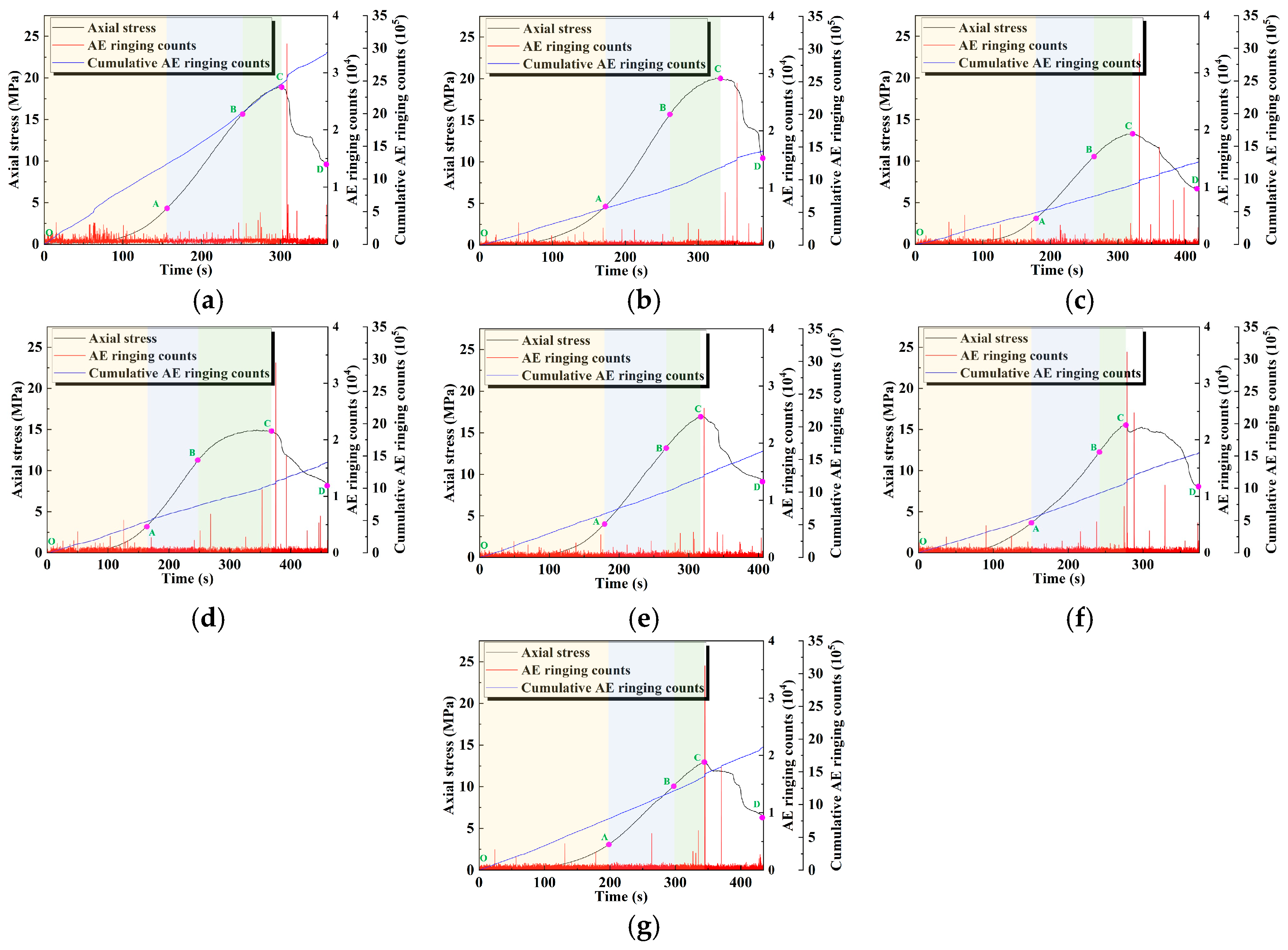 The AE ringing counts can reflect the degree of damage and degradation of the internal structure of the material during loading [