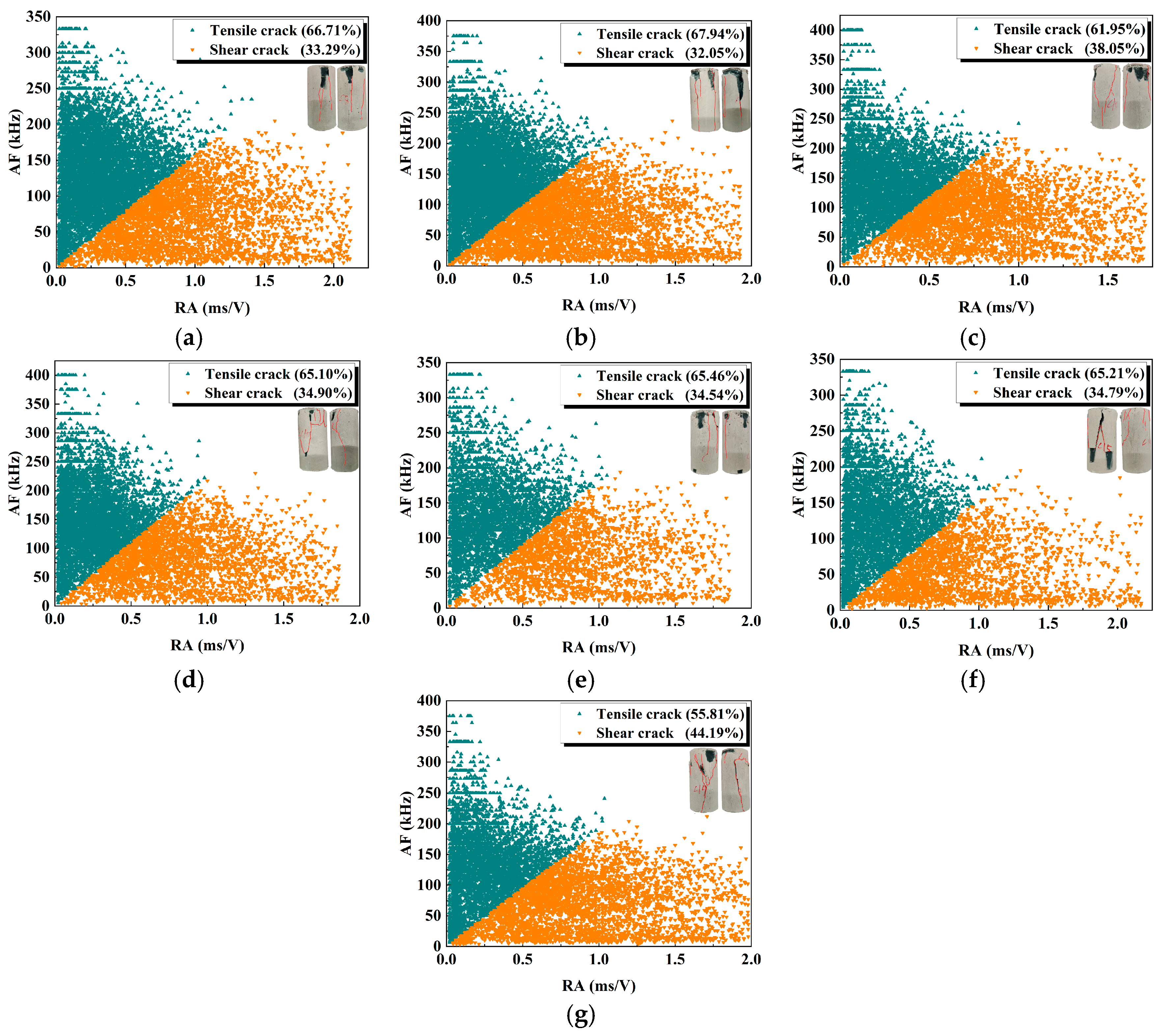 AF relationship and the statistical results of tensile–shear cracks under the influence of different activator moduli and water–cement ratios.