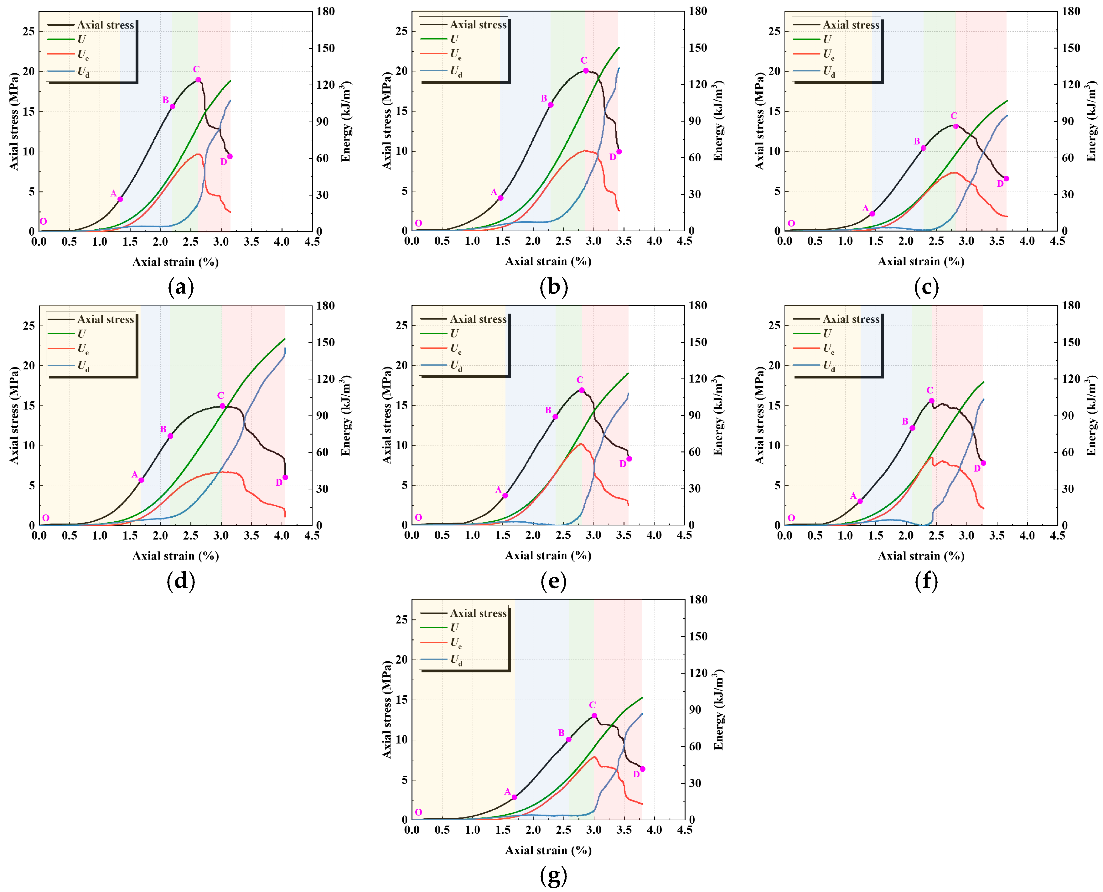 Ud become less pronounced, indicating a more stable energy dissipation process and thereby reflecting reduced material brittleness.