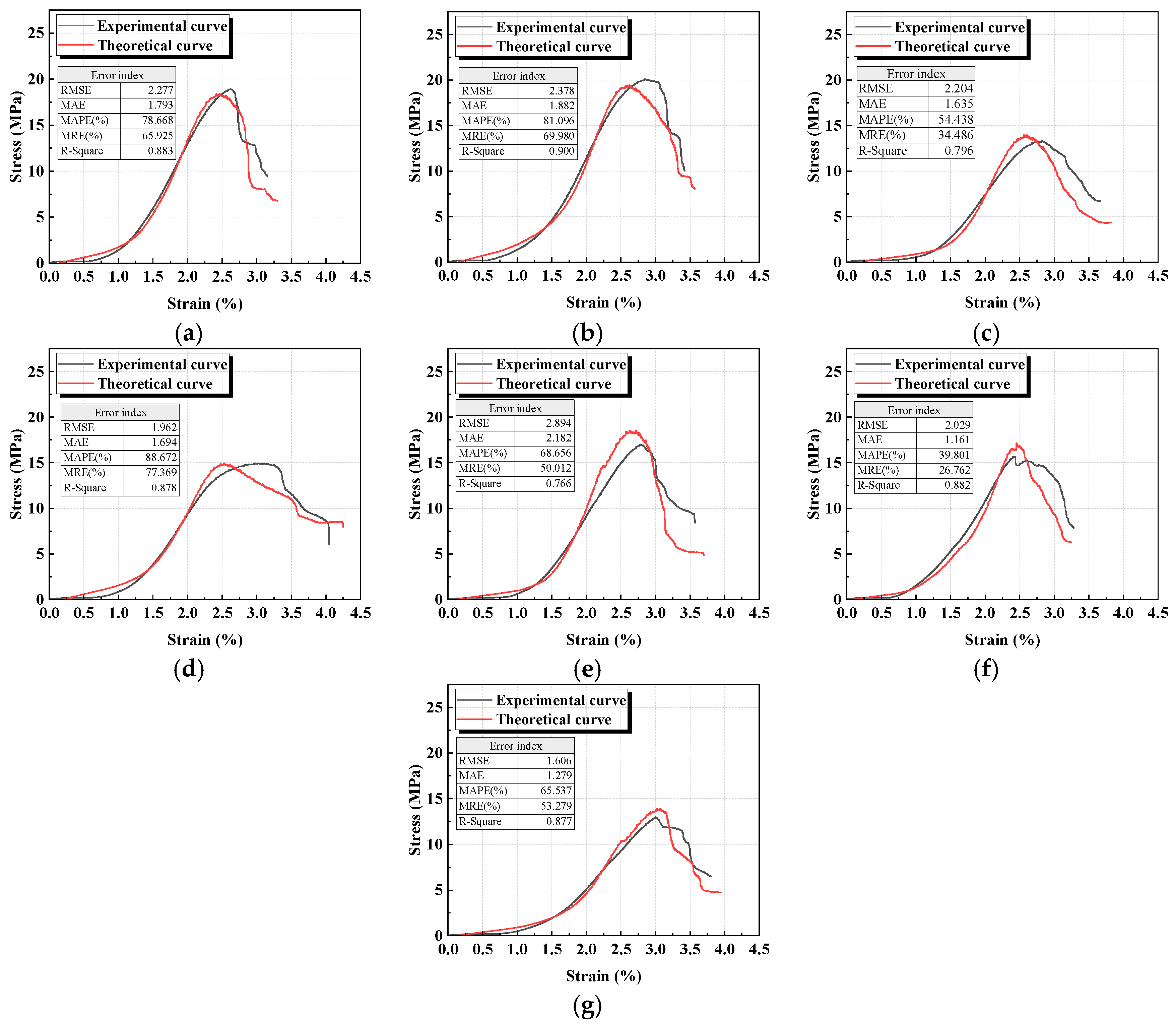 Figure 9. The fitted parameters are shown in the figure. The results indicate that the theoretical curves are in strong agreement with the experimental ones, effectively representing the stress–strain curves of geopolymer specimens with varying activator moduli and water-to-binder ratios. This further provides a useful reference for the engineering design of geopolymers.