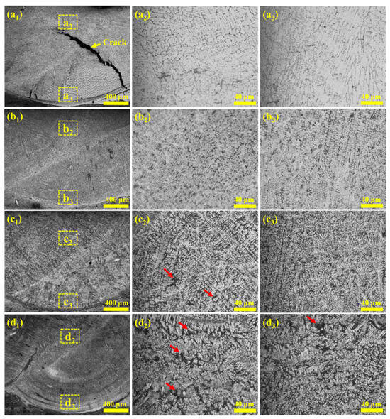 Figure 1 illustrates the optical microstructures of the coatings prepared with different Nb contents. Specifically, Figure 1a1–d1 depict the macroscopic cross-sectional morphologies of the coatings, while Figure 1a2–d2 and Figure 1a3–d3 present the corresponding morphology of the coating zone and interfacial bonding zone, respectively. Owing to the rapid heating and cooling characteristics inherent in laser cladding, the coatings exhibit typical non-equilibrium rapid solidification microstructures []. Macroscopic cracks are evident in the Nb-A coating with low Nb content (as indicated by the yellow arrows in Figure 1a1). The formation of cracks in the Nb-A coating can be attributed to insufficient Nb addition, which fails to effectively suppress the precipitation of brittle phases. At low Nb levels, coarse Cr23C6 carbides and (Fe,Cr) primary solid-solution phases preferentially segregate along grain boundaries. These brittle constituents induce local stress concentration and act as crack initiation sites [,,]. During subsequent cooling, thermal contraction promotes the propagation of these cracks along weakened grain boundaries, ultimately leading to the formation of macroscopic cracks within the coating. These cracks gradually disappear as Nb content increases. The interface between the coating and the substrate displays a characteristic arc-shaped bonding morphology, evidencing reliable metallurgical bonding. This observation suggests that a higher Nb content effectively mitigates the coating’s brittleness []. Furthermore, increasing the Nb content induces significant grain refinement in both the coating zone and the bonding interface []. However, segregation occurs in the coating when the Nb content exceeds 5 wt.%, (as indicated by the red arrows in Figure 1).