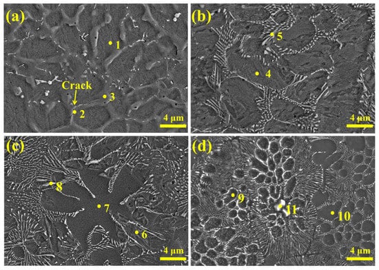 Elevated Nb levels induce morphological changes in the precipitates. Concurrently, this also facilitates a secondary redistribution of the Cr element within the matrix. As evidenced in Figure 2a–c), the Cr content within the martensitic matrix exhibits an increase from 5.74 wt.% to 5.88 wt.% when Nb contents range from 1 wt.% to 5 wt.%. Localized Cr enrichment is observed in honeycomb-structured regions of the specimen with 6 wt.% Nb content. This phase exhibits a substantially elevated Cr content of 7.05 wt.%, indicative of a significant enrichment. These results demonstrate that the NbC extension from grain boundaries into grain interiors promoted localized Cr enrichment, leading to honeycomb-like segregation.