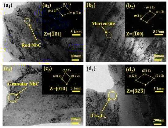TEM images and SAED patterns of (a1,a2) Rod NbC; (b1,b2) Martensite; (c1,c2) Granular NbC; (d1,d2) Cr23C6 in Nb-B coating.