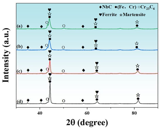 To examine the effect of Nb content on the morphological evolution of the Fe-based alloy coatings, high-magnification observations of the coating region are presented in Figure 2. At lower Nb contents, a distribution of coarse, skeleton-like primary phases was observed continuously along grain boundaries, forming a network-like structure. Preliminary statistical analysis based on SEM images indicates that, with the increase in Nb content, the area fraction of NbC increases significantly from 2.67% (NB-A) to 6.94% (NB-B), 9.43% (NB-C), and 20.51% (NB-D). With increasing Nb content, these grain boundary skeleton-like phases disappeared, replaced by finely dispersed rod-shaped precipitates. As illustrated in Figure 2c, when the Nb concentration was set at 5 wt.%, the coating matrix exhibited a dual-phase structure, characterized by a martensite–ferrite structure. When the Nb content reached 6 wt.% (Figure 2d), precipitate segregation occurred. It extended from grain boundaries into grain interiors and formed localized honeycomb-like composite structures.