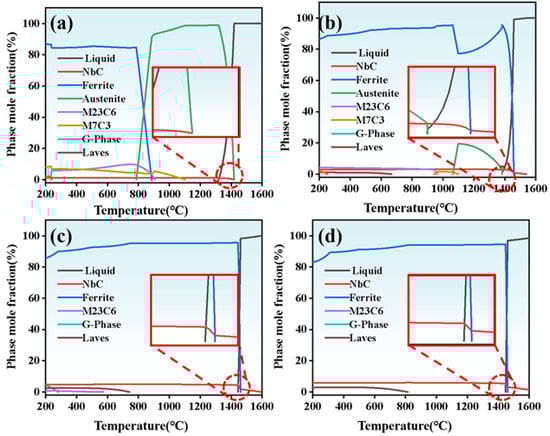 The thermodynamic equilibrium phase diagrams of coatings (a) Nb-A; (b) Nb-B; (c) Nb-C; and (d) Nb-D.