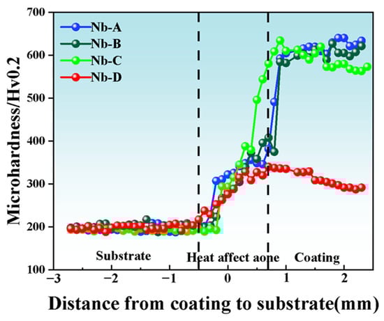 Microhardness distribution curves of the coatings (a) Nb-A; (b) Nb-B; (c) Nb-C; and (d) Nb-D.