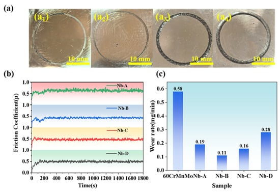 (a) Surface morphology: (a1) Nb-A, (a2) Nb-B, (a3) Nb-C, (a4) Nb-D; (b) COF curves; and (c) wear rate of coatings after frictional experiment.