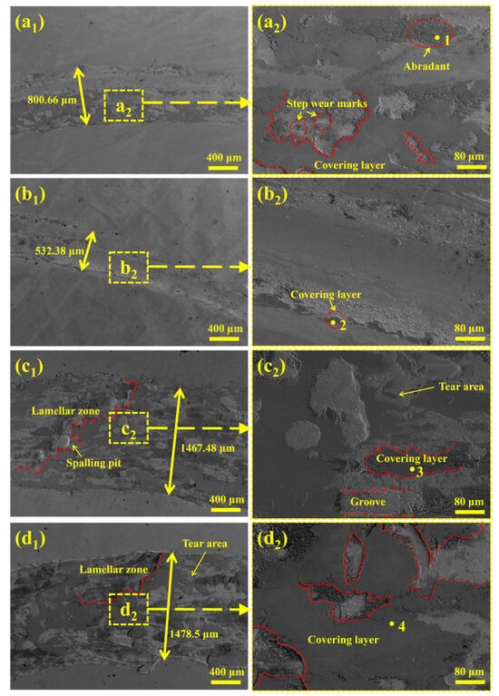 The Nb-C and Nb-D coatings, featuring ferrite/martensite dual-phases, show distinct wear behaviors. As reported by Ouyang et al. [], non-uniform soft–hard phase distribution generates lamellar zones on the worn surface, with ferrite serving as spalling initiation sites. Repeated adhesion–detachment cycles form grooves and pits, transitioning the wear mechanism to adhesive–abrasive dominance. For the ferrite-rich Nb-D coatings, Figure 8c1–d1 illustrate extensive lamellar zones and tear areas, while Figure 8c2–d2 reveal wear pits filled with abrasives and distinct spalling features. The increased ferrite content and non-uniform dual-phase distribution are identified as the primary causes of severe wear, culminating in the highest wear loss observed in Nb-D.