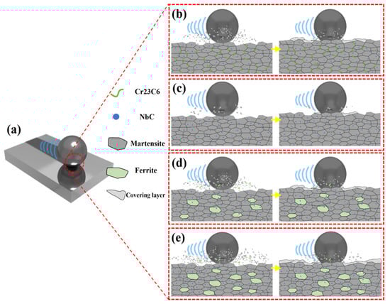 (a) Schematic diagram of friction and wear and (b–e) wear cross-section diagrams of specimens with different Nb contents: (b) Nb-A; (c) Nb-B; (d) Nb-C; and (e) Nb-D.