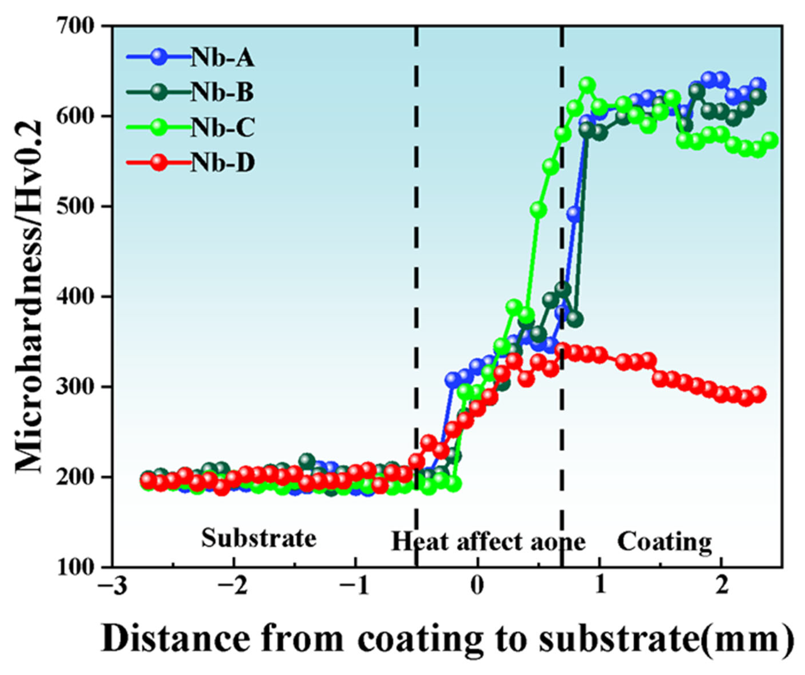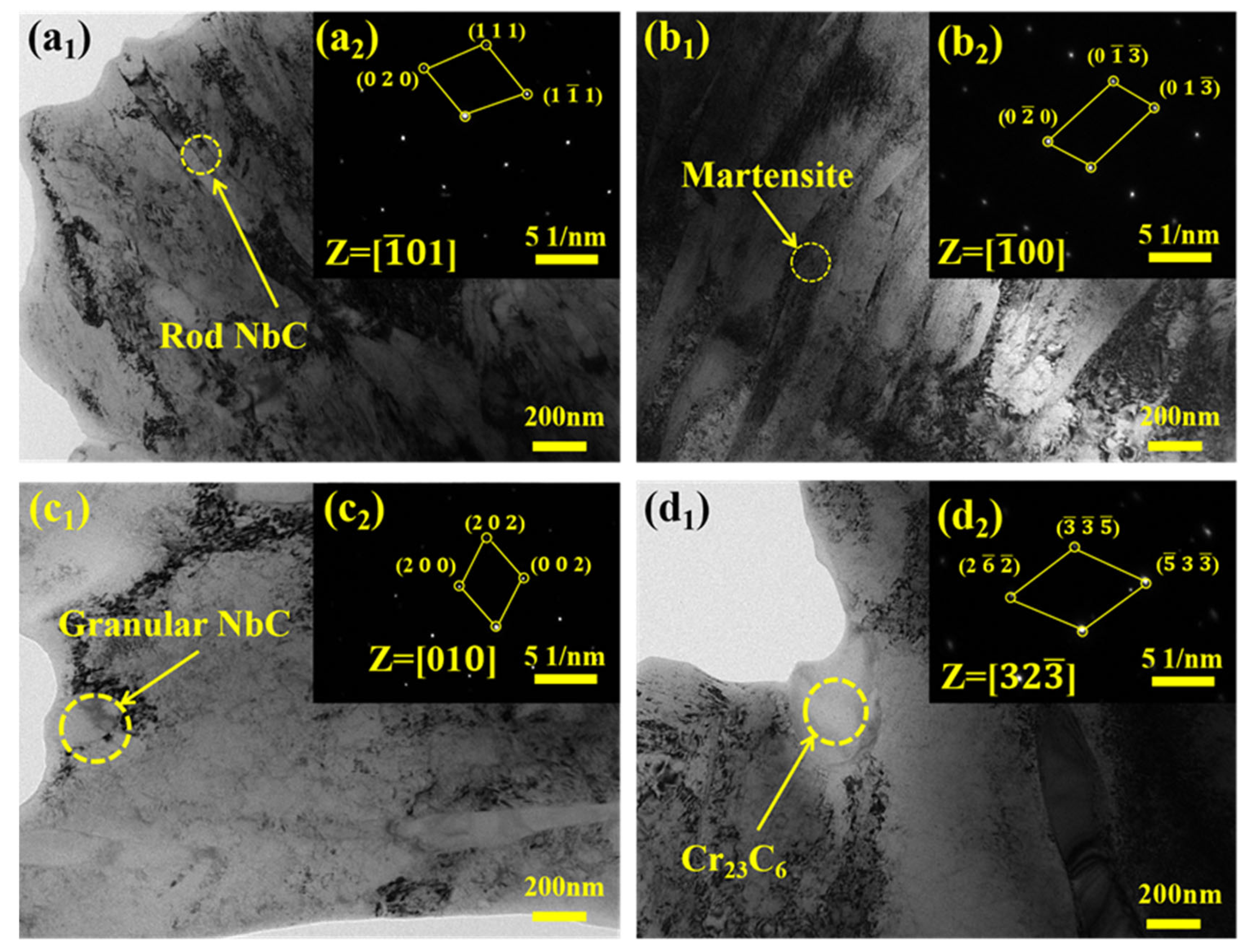 - Cao, Y.B.; Zhi, S.X.; Qi, H.B.; Zhang, Y.; Qin, C.; Yang, S.P. Evolution Behavior of Ex-Situ NbC and Properties of Fe-Based Laser Clad Coating. Opt. Laser Technol. 2020, 124, 105999. [Google Scholar] [CrossRef]