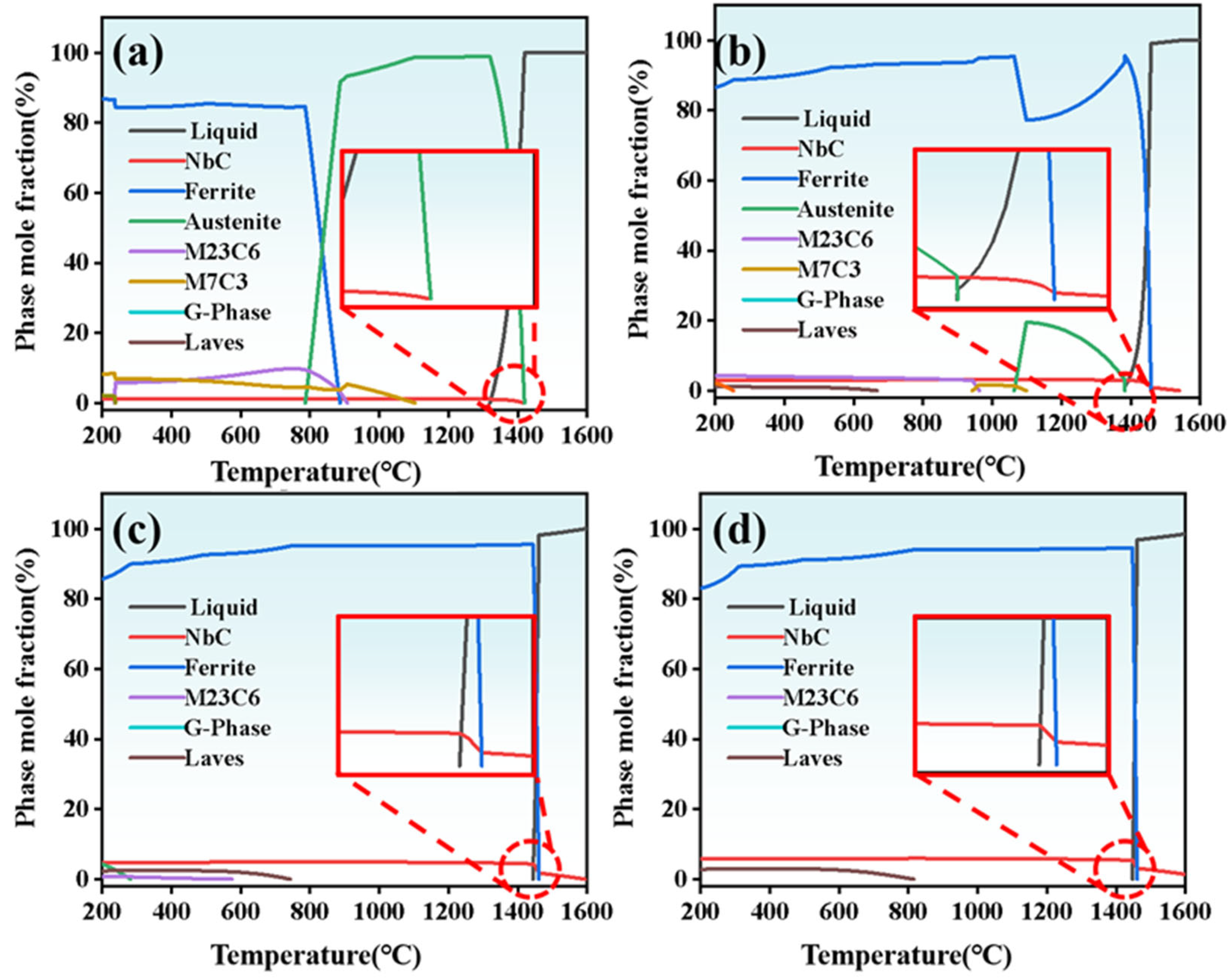 - Haddad, F.; Amara, S.E.; Kesri, R. Liquidus Surface Projection of the Fe–Nb–C System in the Iron-Rich Corner. Metall. Mater. Trans. A 2008, 39, 1026–1033. [Google Scholar] [CrossRef]