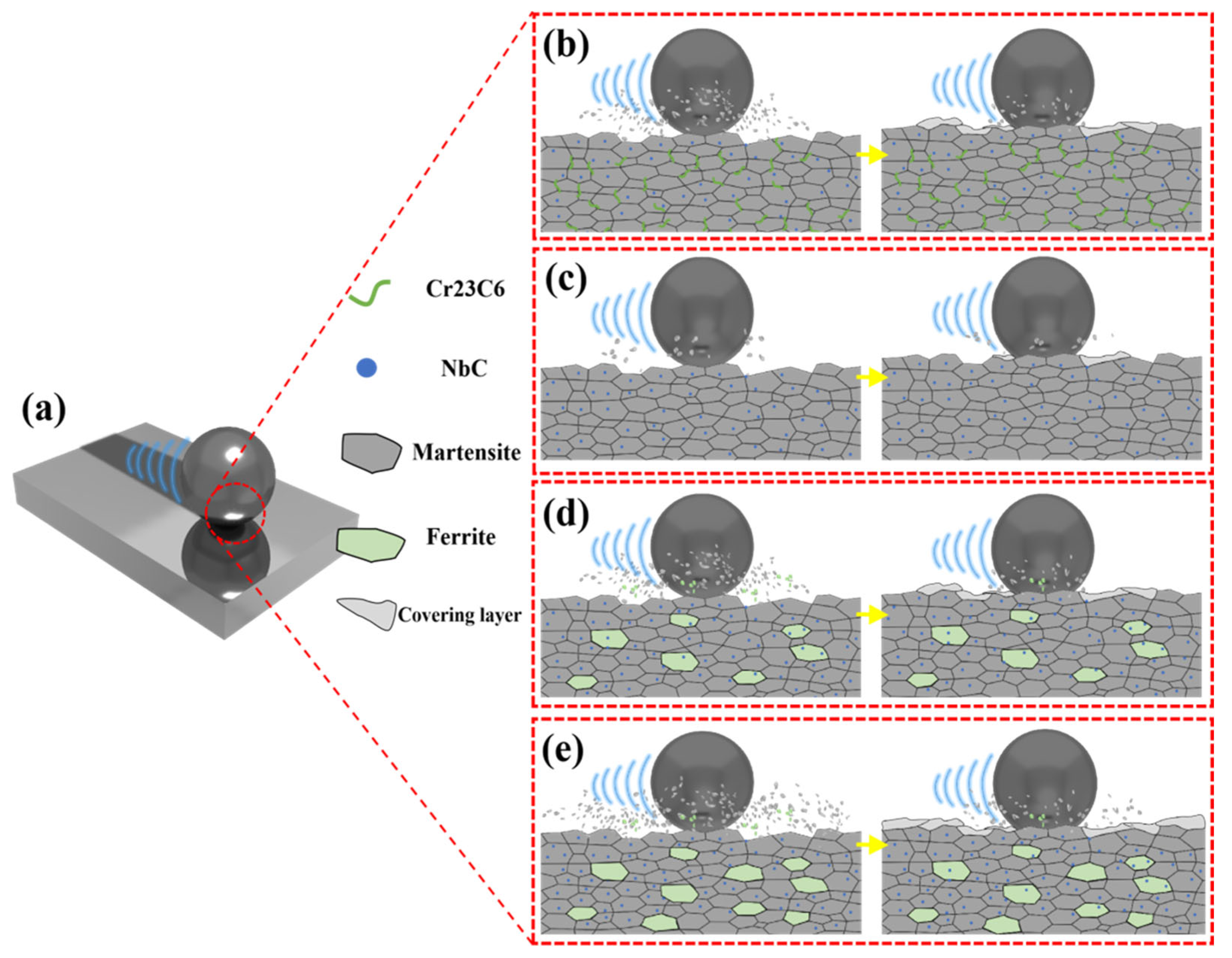 - Lian, G.; Yue, K.; Zeng, J.; Feng, M.; Lan, R.; Kong, L. Microstructures and Properties of NbC-Reinforced Ni-Based Coatings Synthesized In Situ by Ultrasonic Vibration-Assisted Laser Cladding. Materials 2023, 16, 1704. [Google Scholar] [CrossRef] [PubMed]