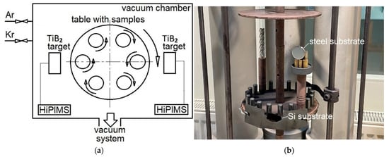 Plasma-based deposition techniques of interest for improving the surface properties of engineering components. While titanium (Ti) coatings are valuable as adhesive interlayers due to their thermal expansion properties, their low hardness (ca. 2.5 GPa) and poor wear resistance make them unsuitable for many demanding applications [,,,,,,]. To overcome these limitations, the addition of boron during deposition creates titanium diboride (TiB2), a high-performance ceramic coating. With its hexagonal crystal structure, high melting point (3225 °C), and exceptional hardness (over 30 GPa), TiB2 is a prospective material for increasing wear resistance and extending the service life of industrial parts []. TiB2 coatings can be deposited by chemical vapor deposition (CVD) [,], physical vapor deposition (PVD) including pulsed laser deposition (PLD) [], magnetron sputtering (MS) [,,,,,,,,,,,,,,], and high-power impulse magnetron sputtering (HiPIMS) [,,,,,,,,,,,,,,], and has emerged as a promising technology. Compared to conventional magnetron sputtering (MS), HiPIMS generates a high plasma density, which results in a denser microstructure and superior mechanical properties [,,,,,,,,,,,,,,]. However, a notable drawback is the significantly lower deposition rate, which presents a challenge for large-scale industrial use []. The existing body of research on TiB2 coatings has primarily focused on two areas: investigating the impact of technological parameters and doping the coatings with specific elements [,,,,,,]. For instance, studies have explored the effects of bias voltage [], deposition temperature [,], and their combination in the structure of elements like Al, Cu, Si, and N [,,,,,,,]. While these studies have provided valuable insights, they have largely confined their parameter variations to narrow intervals. For example, Nedfors et al. [] and Zhang et al. [] examined frequency and bias voltage changes, but their research work did not provide a comprehensive view of how a wide range of these parameters influences the coating’s properties.