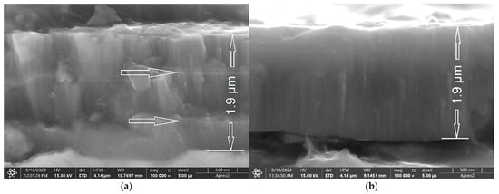 The microstructure of the samples was evaluated by scanning electron microscopy (SEM) using Apreo2 and Scios2 DualBeam microscopes (ThermoFisher Scientific, Brno, Czech Republic). The thickness and grain morphology were determined from cross-sectional views of the coated samples at magnifications ranging from 20,000× to 100,000×.